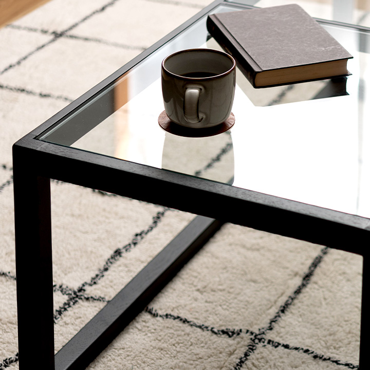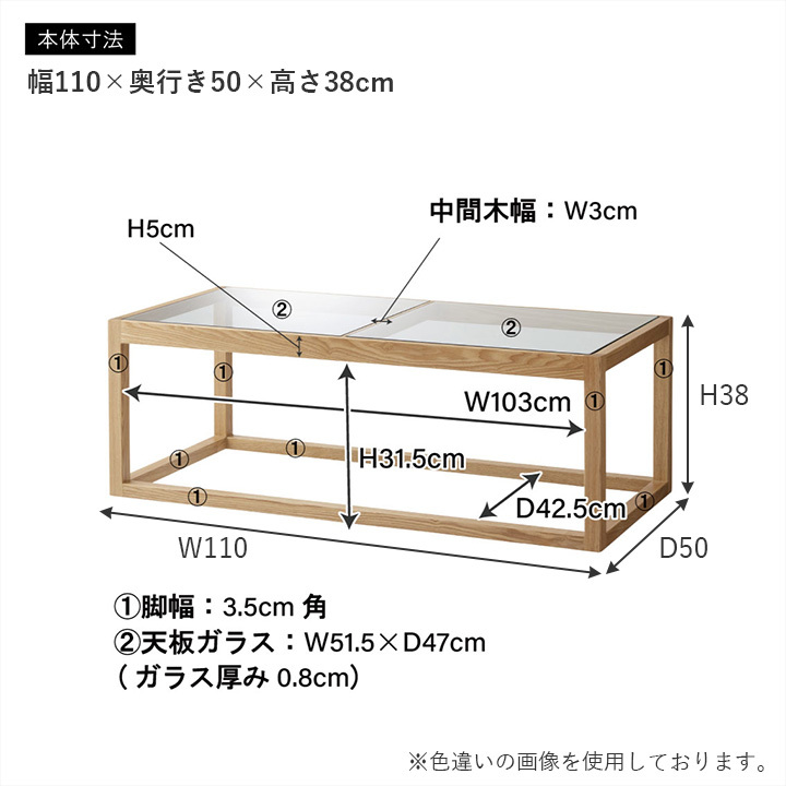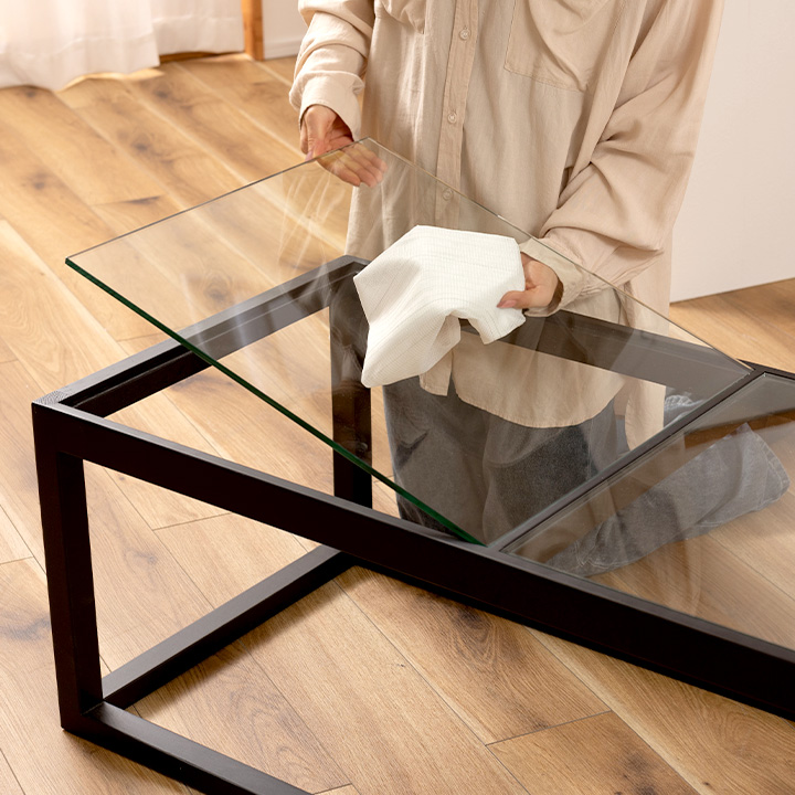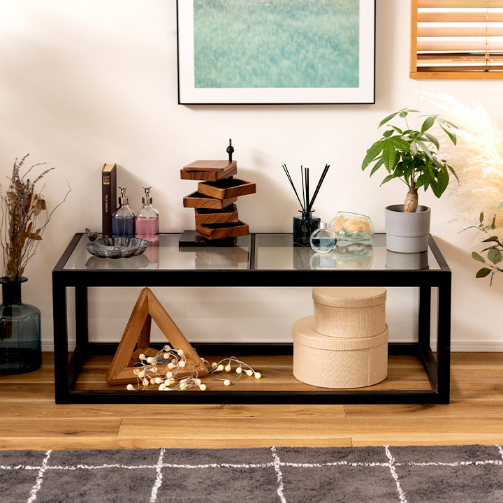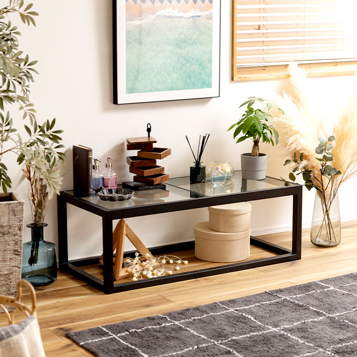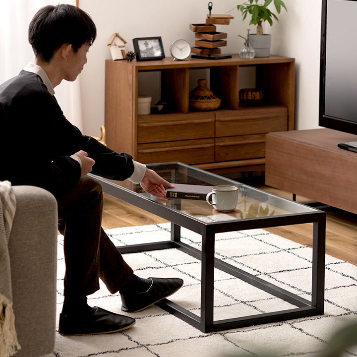 幅110×奥行50×高さ38cmのスクエア型で、省スペースながら存在感のあるデザイン。8mmの強化ガラス天板は、約20kgの耐荷重に対応し、中央のフレームでしっかり支えられているため安心です。