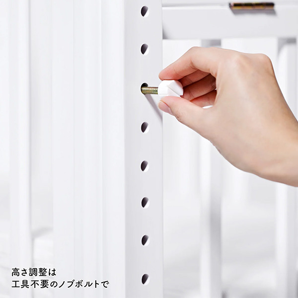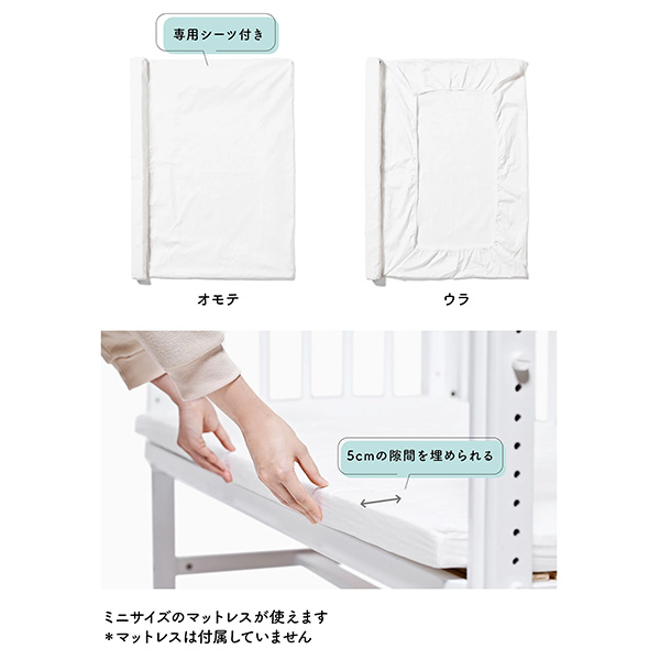 | サイズ | 約幅102×奥行き67×高さ(最大)124cm 【詳細サイズ】 床板高さ:最上段61cmから最下段6.5cmまで約3cm刻みで20段階調整可能 床板部分内寸:約90×60cm 梱包サイズ:約幅101×奥行き77×高さ17.5cm サイドマットレス付きシーツ:約幅90×奥行き65×高さ5cm(サイドマットレス部分のみ) 幅90×奥行き60×厚さ5~6cmの一般的なミニサイズマットレスに対応 |