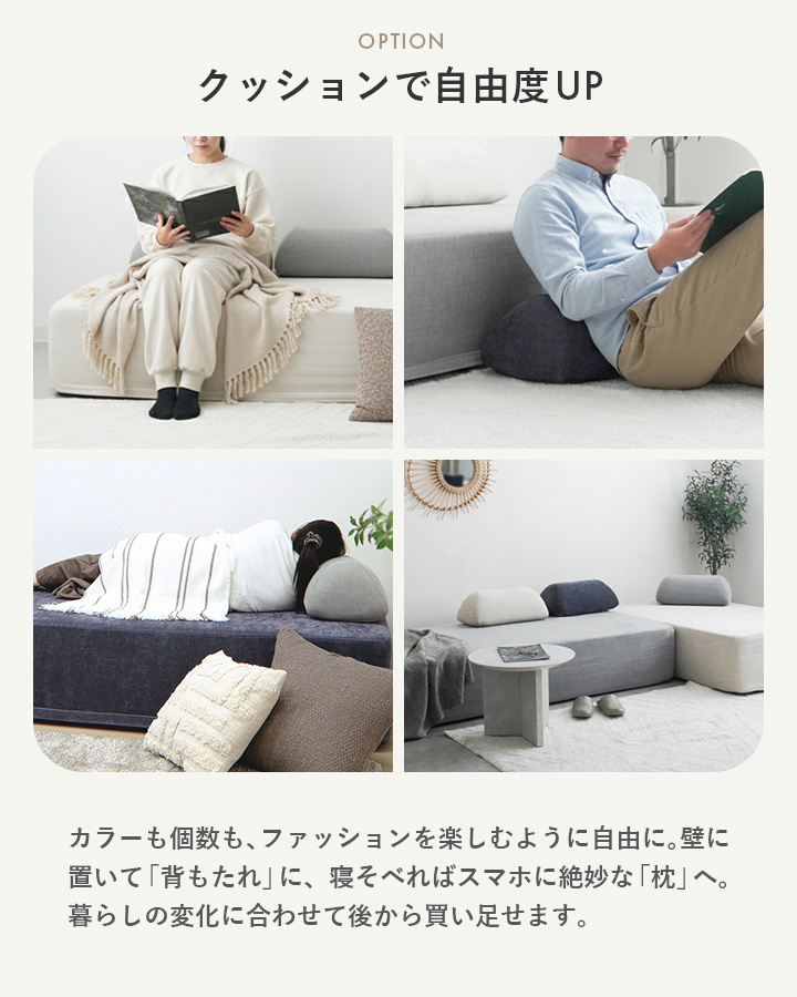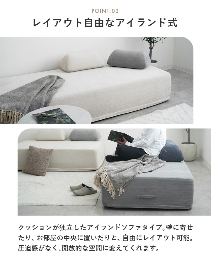 ソファ本体やクッションを自由に配置できるので、ベッド代わりにしたり、カウチスタイルにも。