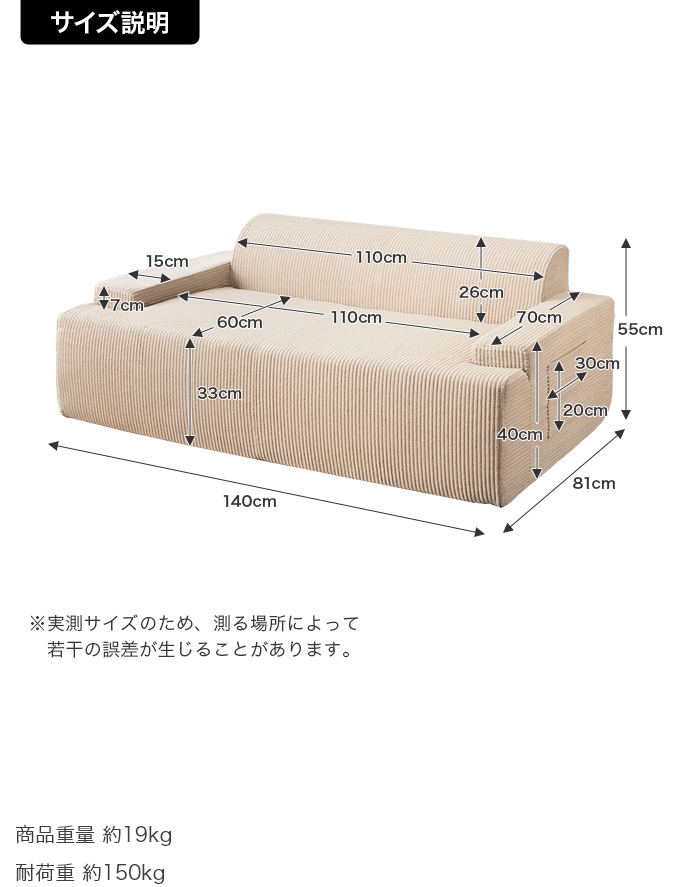 サイズ | 本体サイズ:約 幅140 × 奥行81 × 高さ55cm 梱包サイズ:約 幅92 × 奥行34 × 高さ34cm |