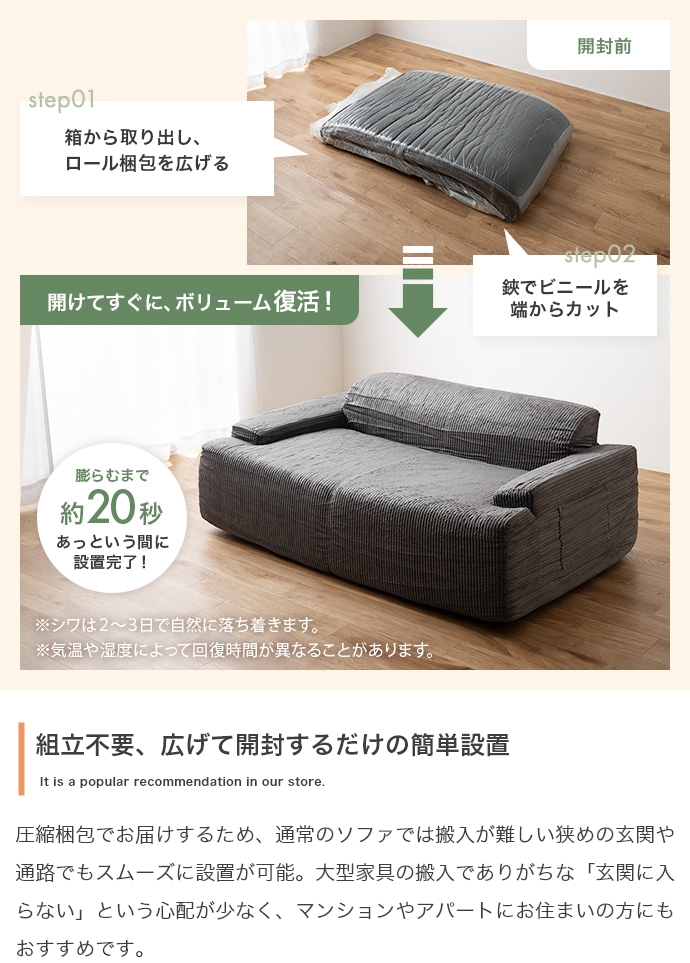 備考 | 圧縮梱包、工具不要 ※開梱時間は2人以上で約5分 |