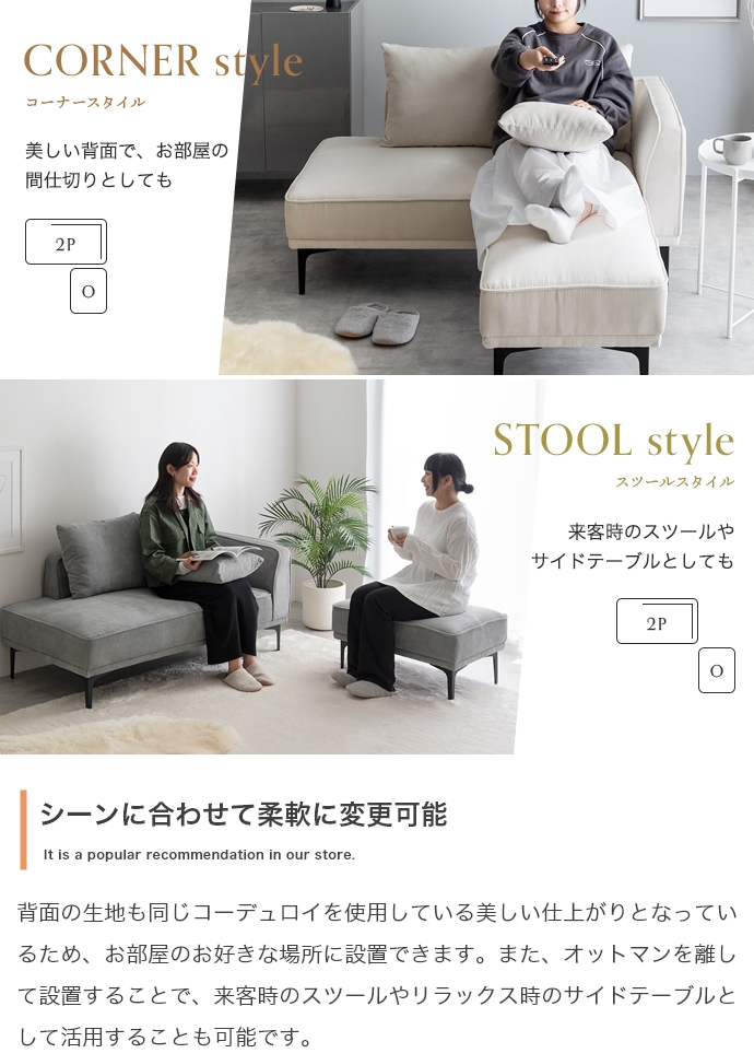 備考 | 2WAY(ロータイプ/ハイタイプ兼用)、オットマン付き ※組み立て時間:2人以上で約15分 ※組立工具は不要。 |