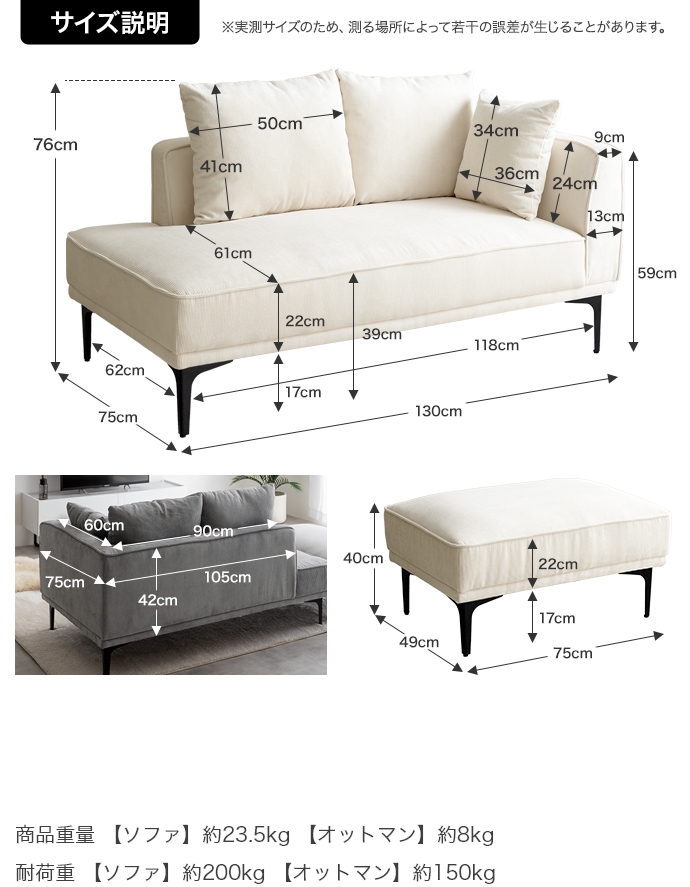 サイズ | ■ソファ (約)幅130 × 奥行75 × 高さ76 × 座面高39cm ■オットマン (約)幅49 × 奥行75 × 高さ40cm |
