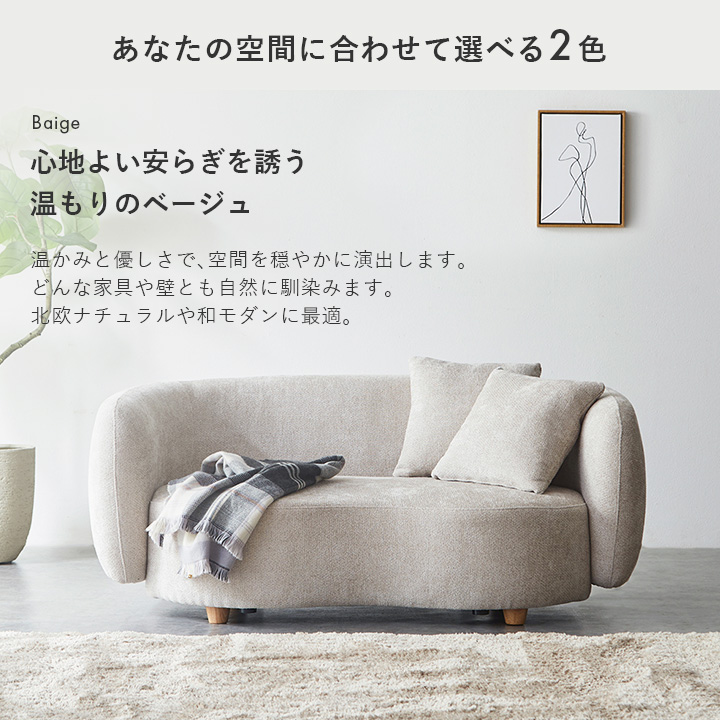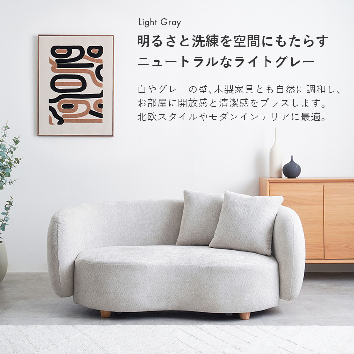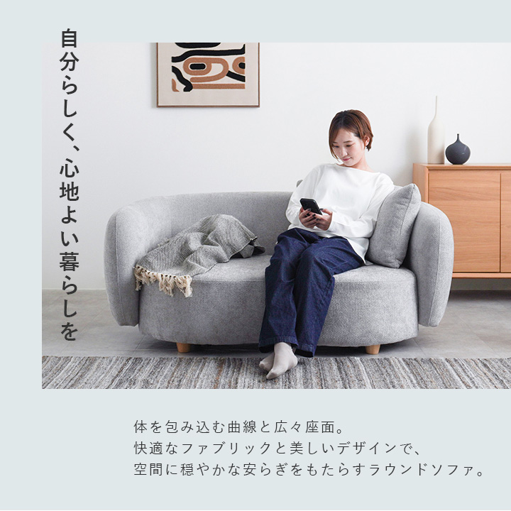 やわらかな曲線と落ち着いた色合いが魅力の2人掛けラウンドソファ。