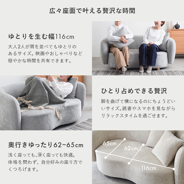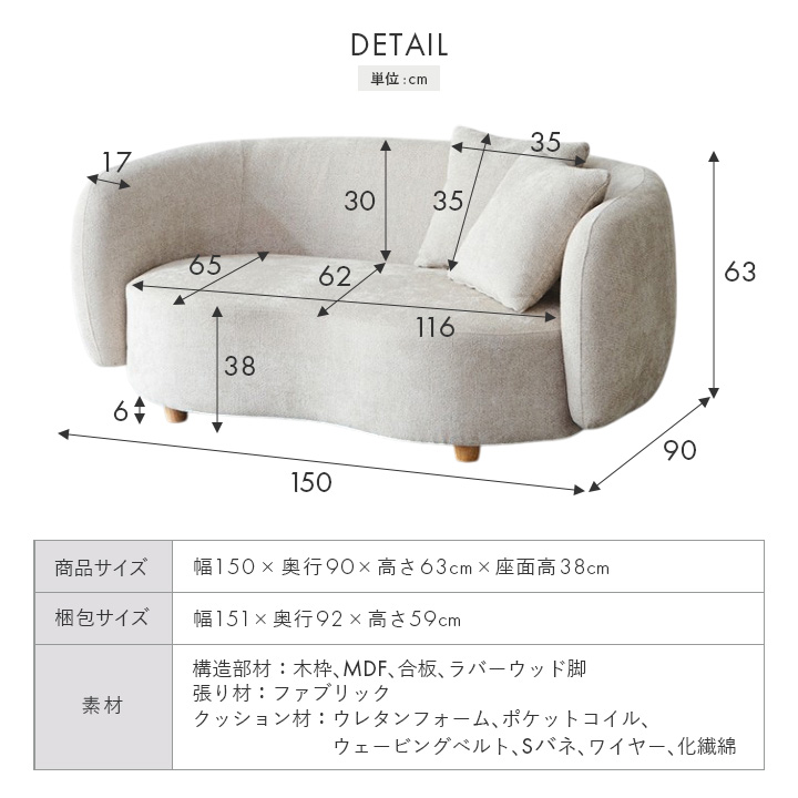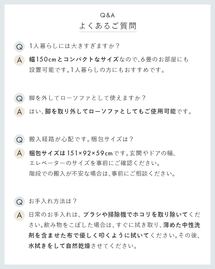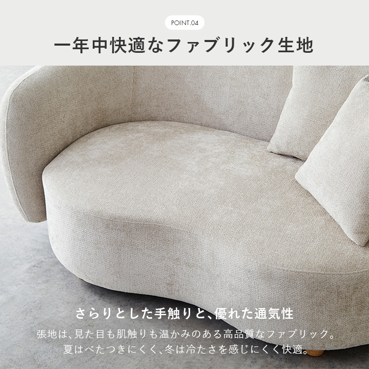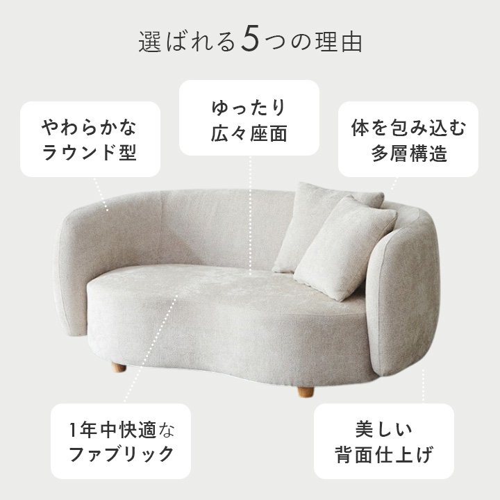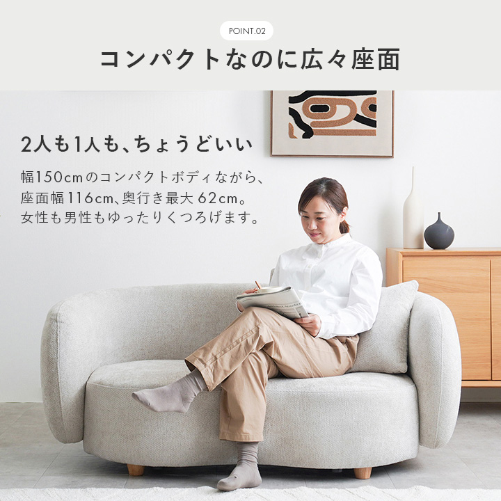 幅150cmのコンパクトサイズで、壁付けやコーナー使い、空間の中央配置も自由自在。角のない柔らかな印象で、空間にやさしさと洗練を演出します。