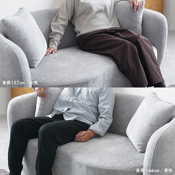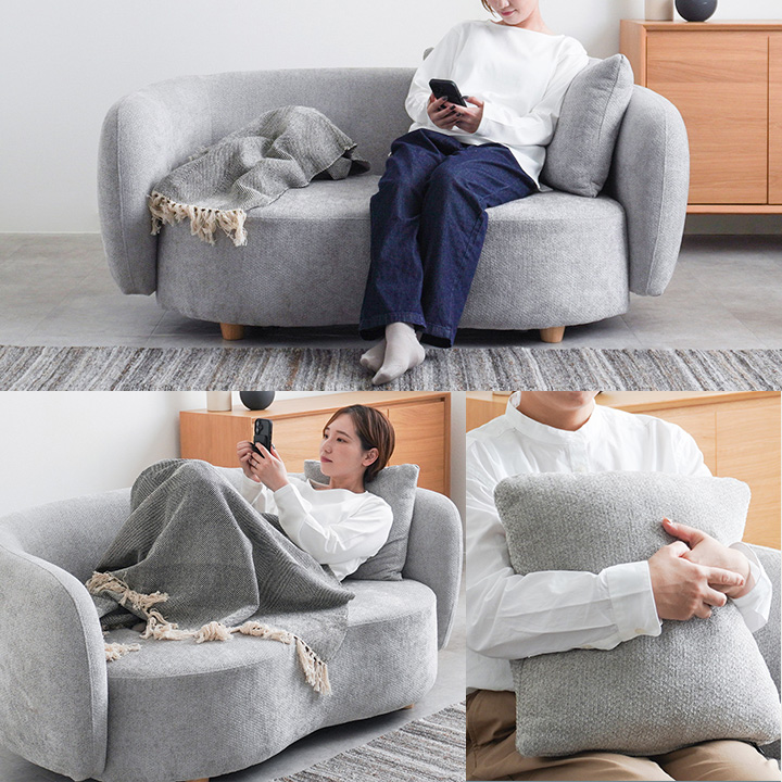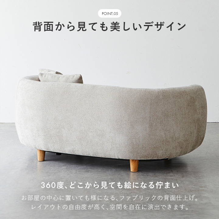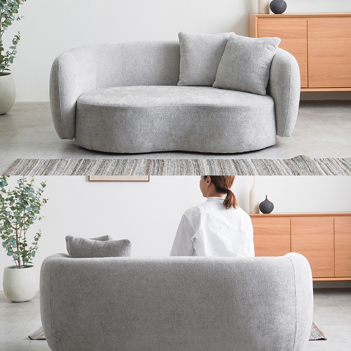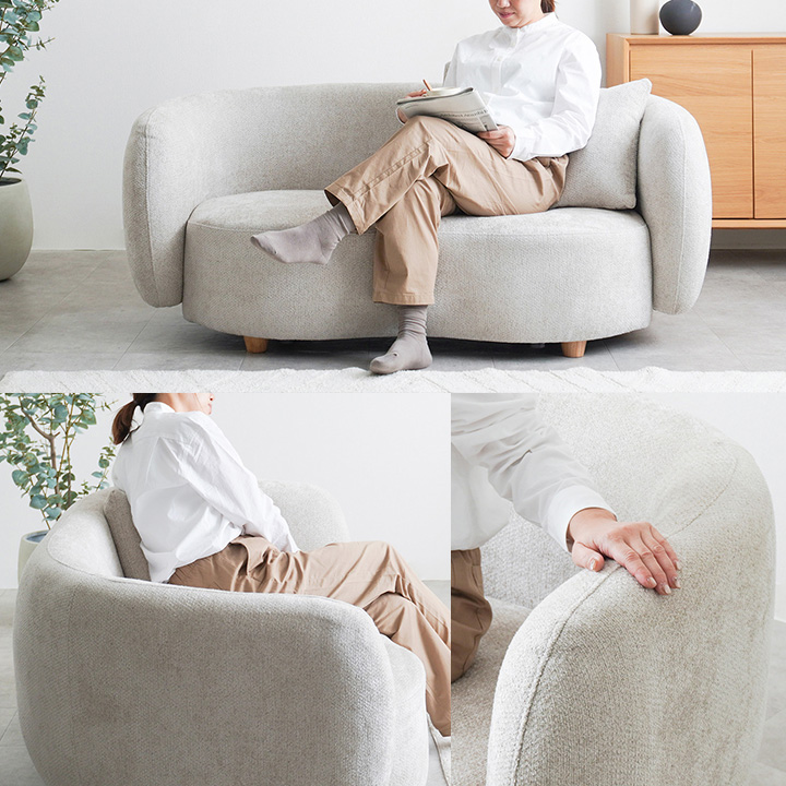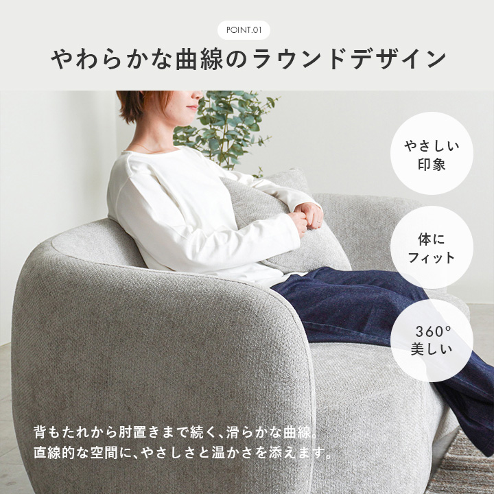 背面からアームまで滑らかに繋がるラウンドフォルムが空間にやさしさと洗練を演出し、角のない柔らかな印象でどんなインテリアにもフィットします。
