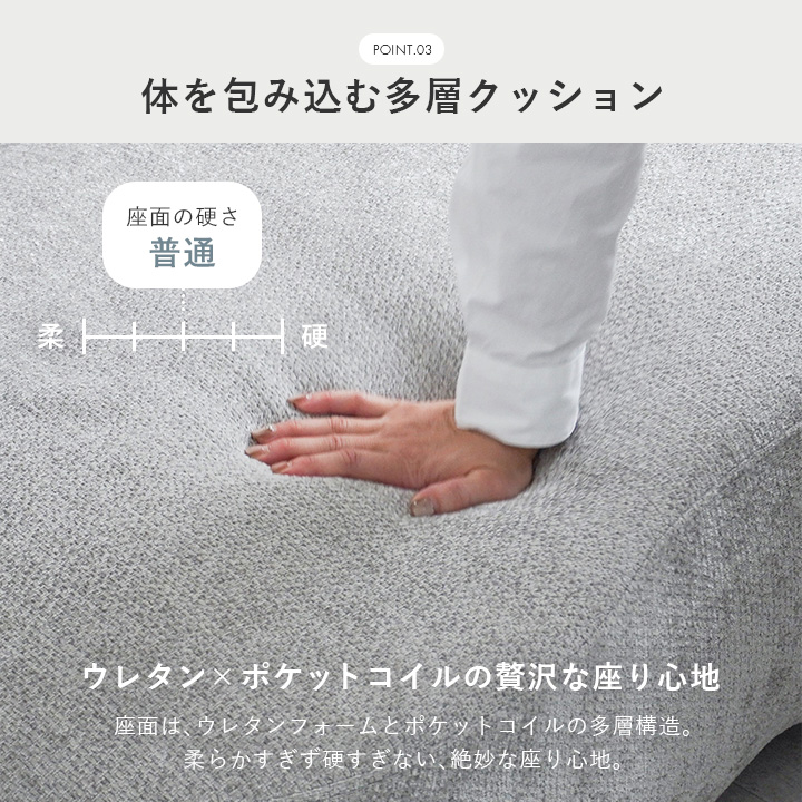 座面にはウレタンフォームとポケットコイル、Sバネを組み合わせた多層構造を採用し、適度な弾力と沈み込みのバランスで長時間座っても疲れにくい設計です。背もたれやアームもふっくらとしたクッションで安心感をプラス。