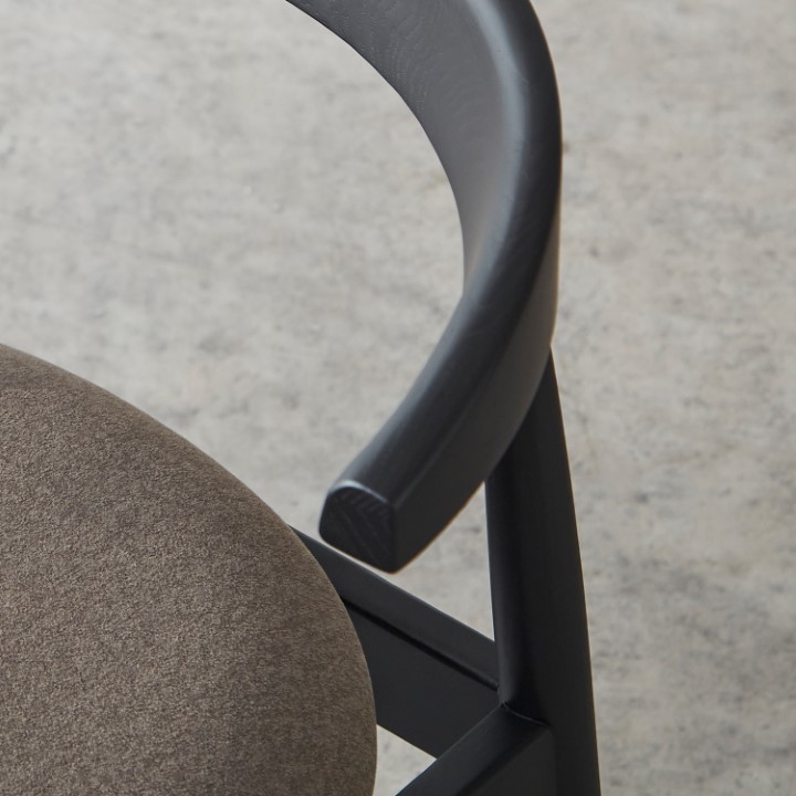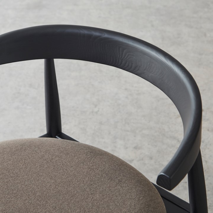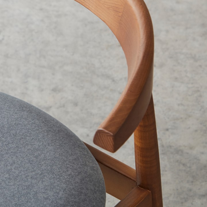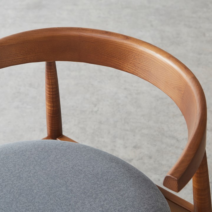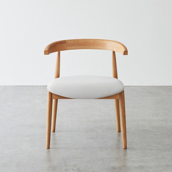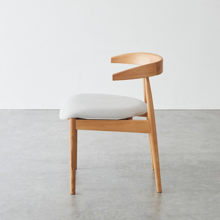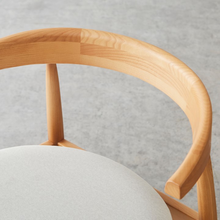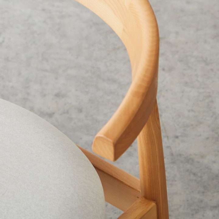 天然木アッシュ材の美しい木目と、優しいファブリックの風合いが調和した、木製アームチェア。 使うたびに感じられる木の温もりと、考え抜かれた機能性が融合し、日常に上質なやすらぎを添える一脚です。