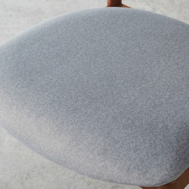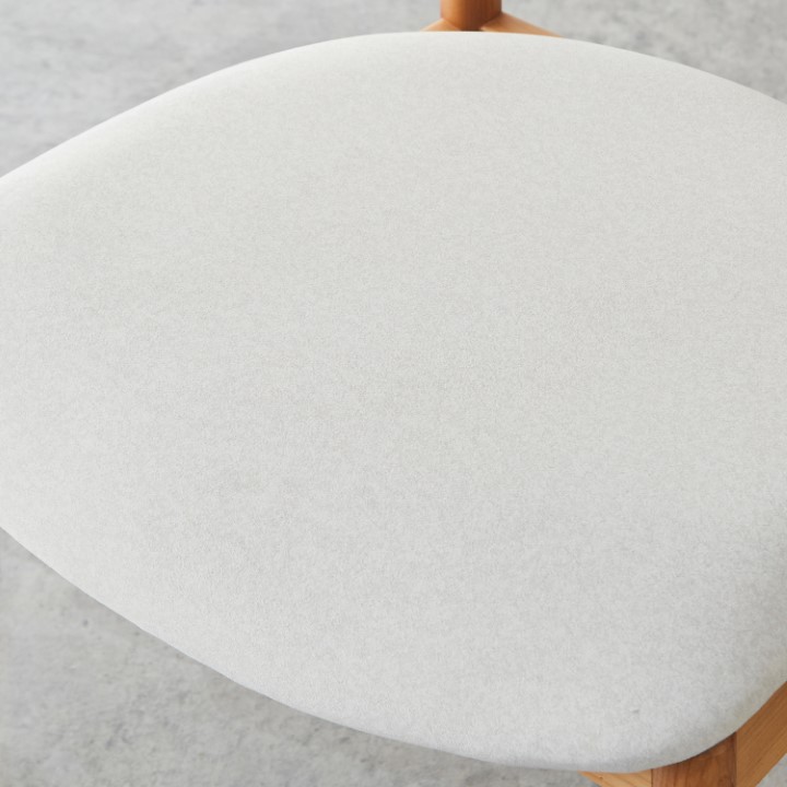 【POINT 1】木の温もりとファブリックの優しい風合い 天然木アッシュ材の美しい木目と、肌触りの良いファブリック座面が絶妙に調和。使うたびに感じられる上質な素材感が、暮らしにやすらぎを添えます。