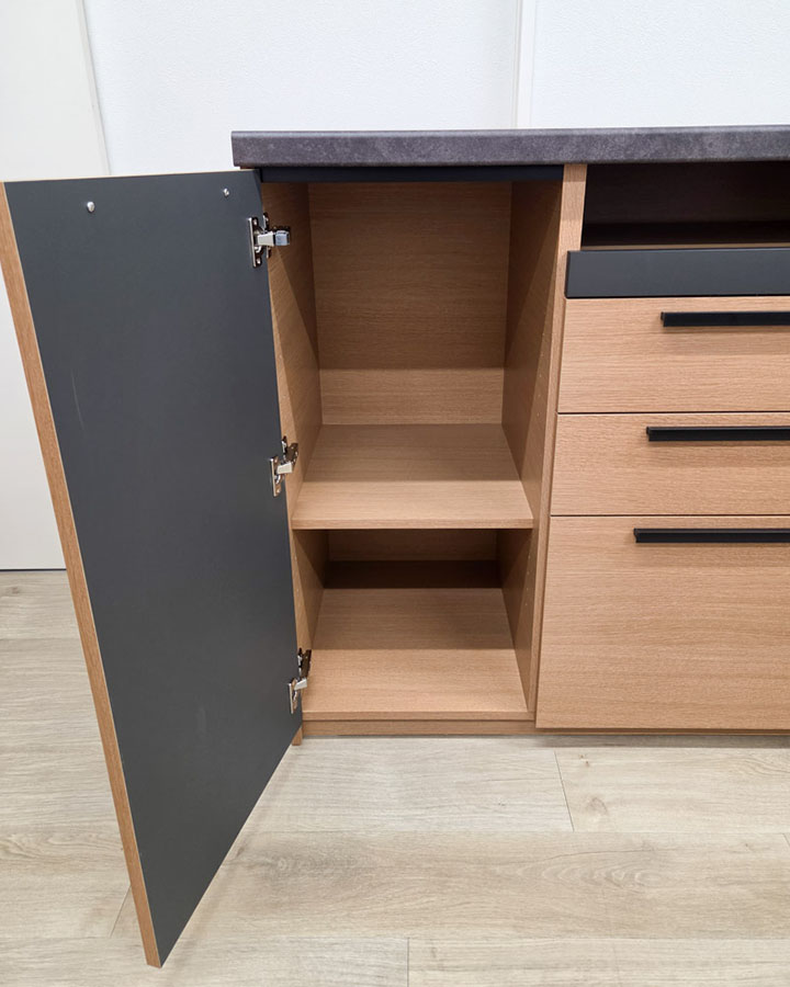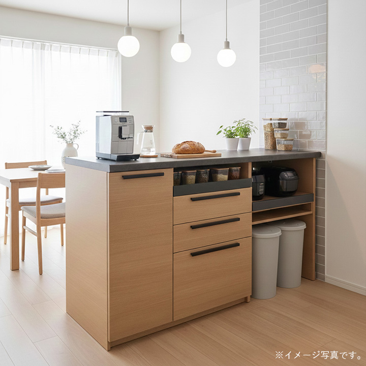 ・幅160cmの広々とした作業面に加え、右下にはゴミ箱も置ける便利なオープンスペースを備えています