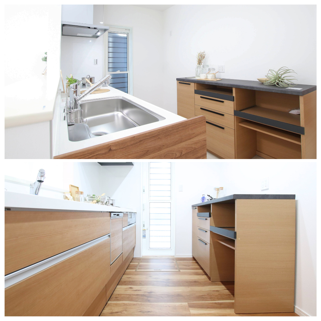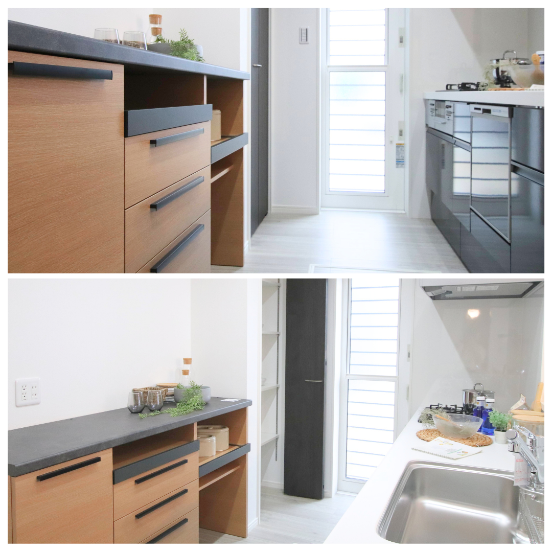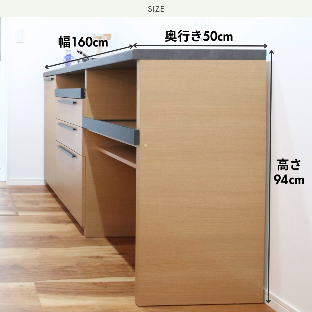 幅160cmタイプでストッカー付き。家電収納やフルスライド引出しで、毎日の料理も快適です。