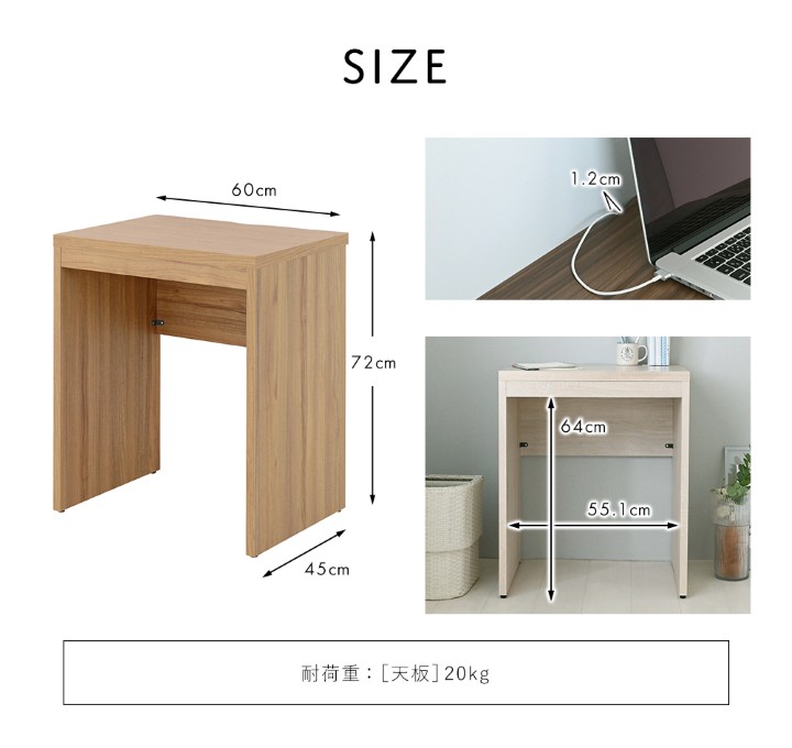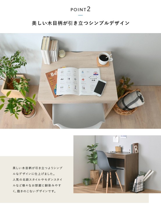 幅約60cmのスマートなサイズで、空間を広々と見せるコンパクトデスク。 美しい木目柄が引き立つシンプルデザインは、さまざまなお部屋に馴染みやすい仕上がりです。