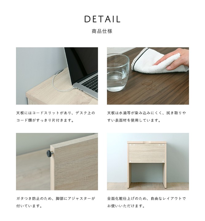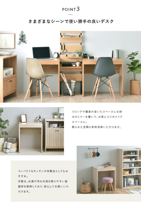 天板は水滴や汚れを拭き取りやすく、デスクとしてはもちろん、キッチンの作業台としても活躍します。