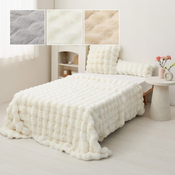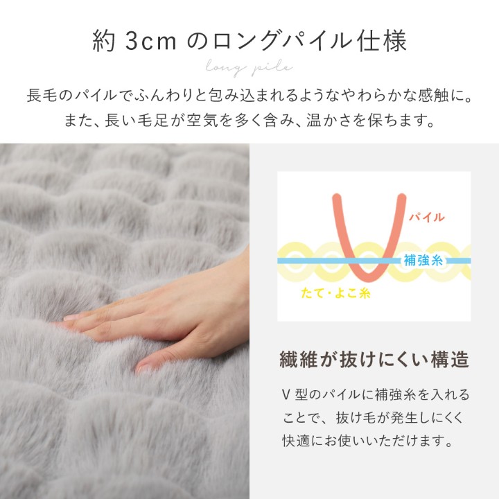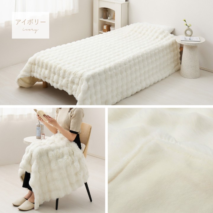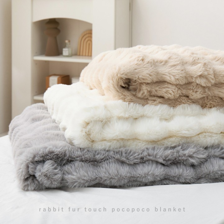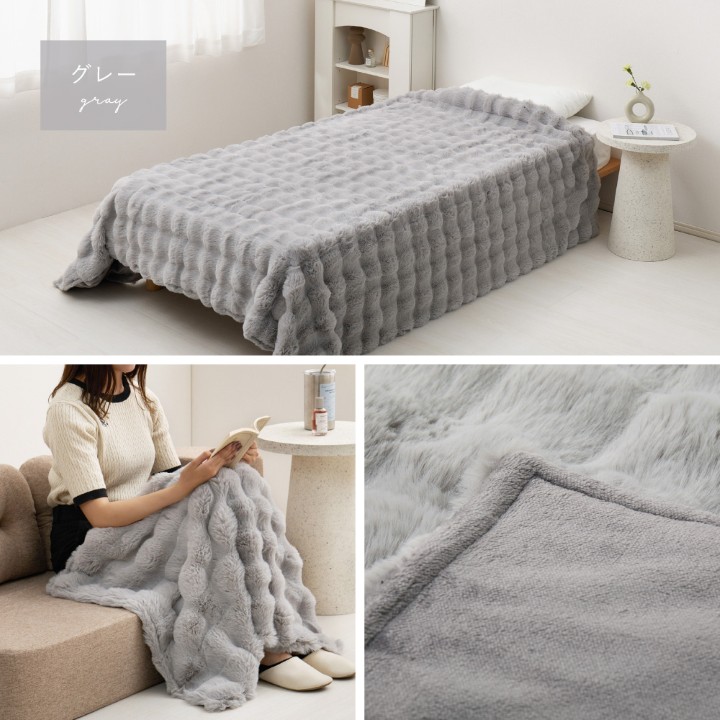 うさぎの毛並みを表現した「ラビットファー調」は、きめ細やかでうっとりするような、なめらかな肌ざわり。 やさしく包み込むようなふわふわタッチに、ぽこぽことした見た目も可愛いおしゃれな毛布です。2枚合わせでほどよくボリュームがあり、しっかりとあたたかさを保ちます。