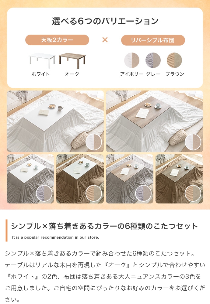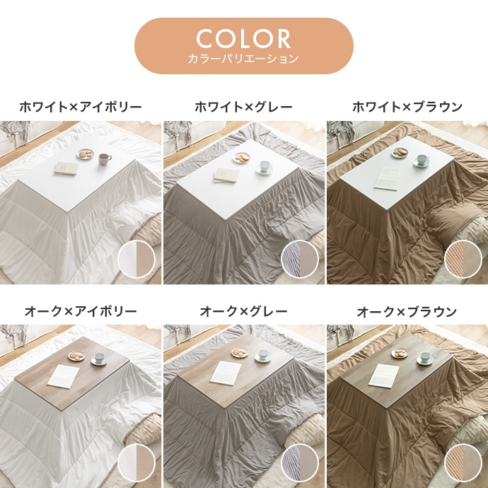 | 素材 | 【テーブル】 ホワイト:天板:パーティクルボード(PVC貼り)、MDF(PVC貼り)、中天板:パーティクルボード(紙貼り) オーク:天板・中天板:パーティクルボード(紙貼り)、MDF(紙貼り) ヒーター:MS-303H(B) 300W石英管ヒーター(中間スイッチ) 【布団】側生地:ポリエステル100%(表地:コーデュロイ/裏地:フランネル) 中材:ポリエステル100% |