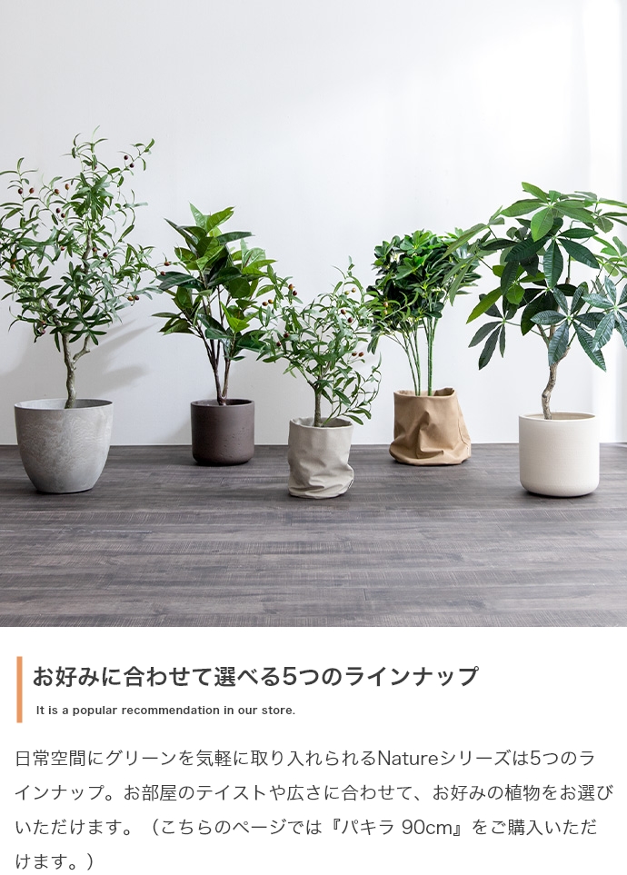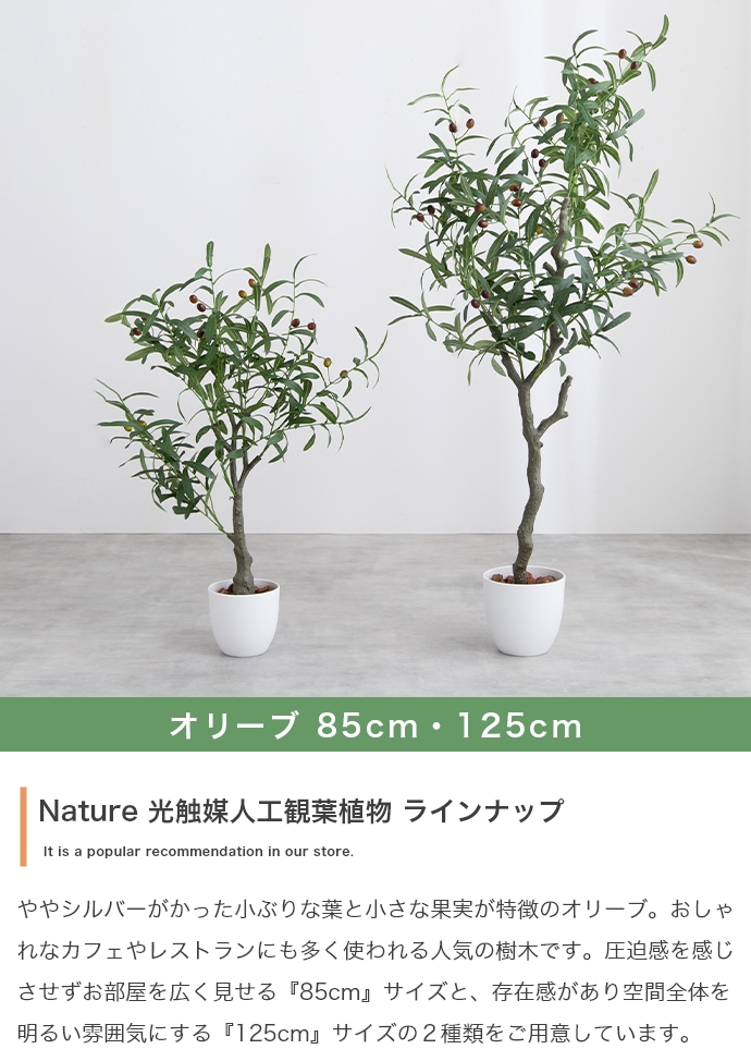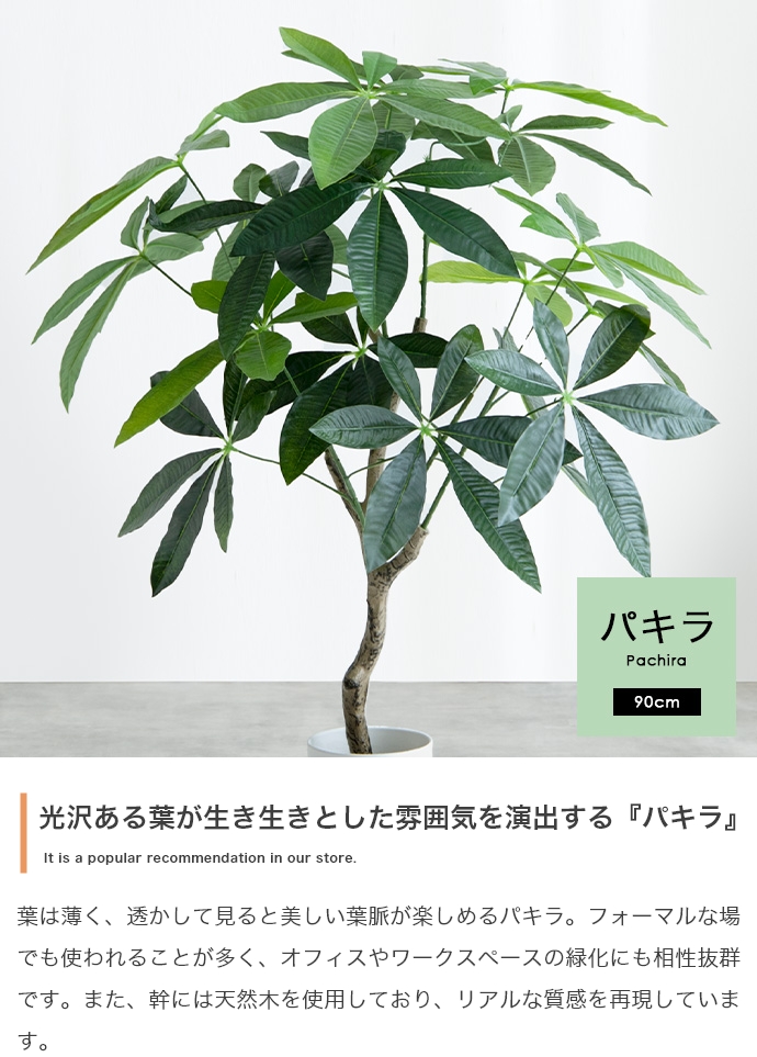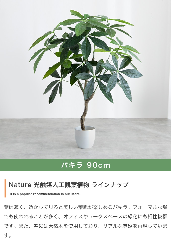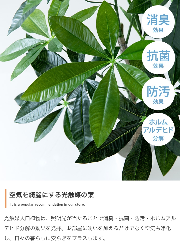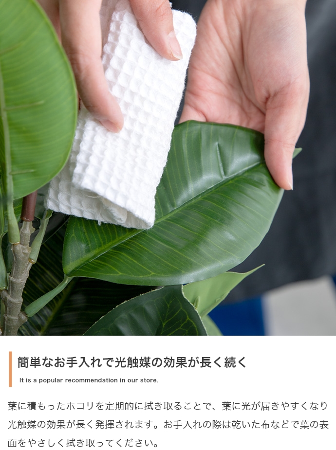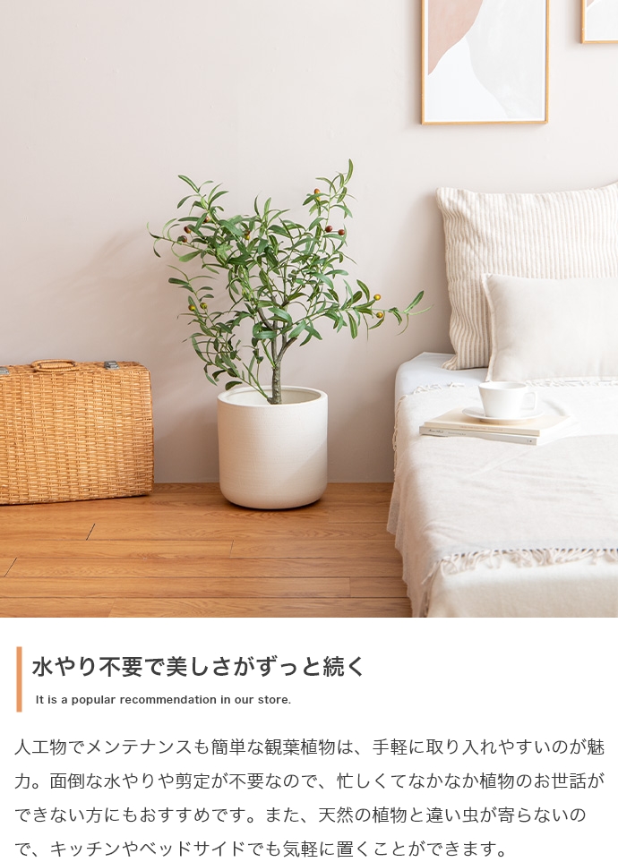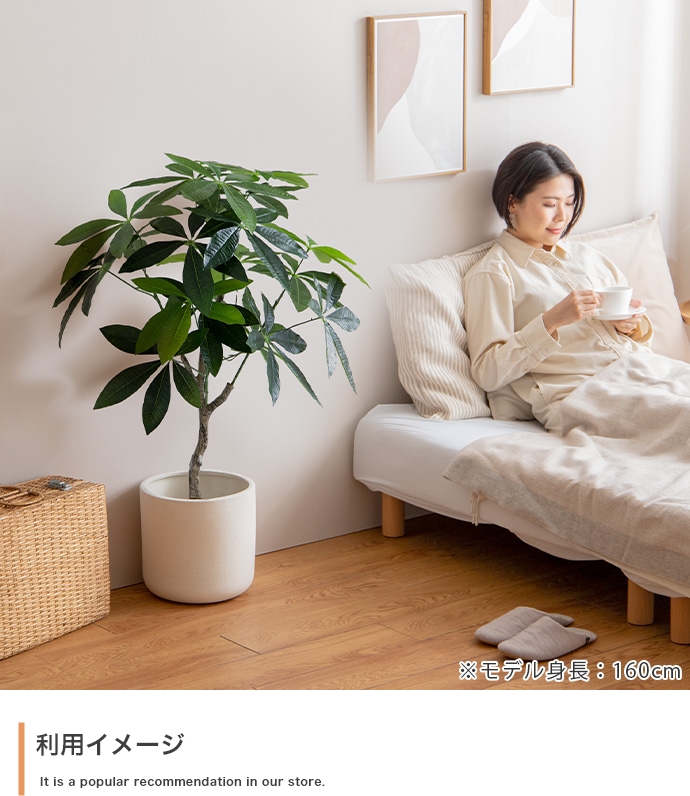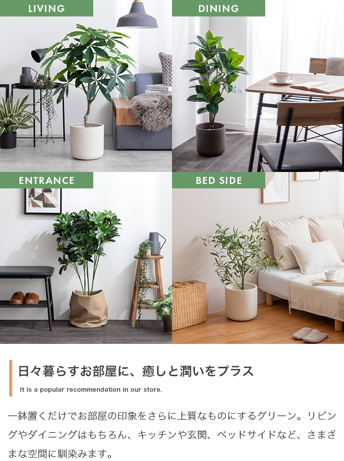 | 備考 | ※鉢カバーは付属しません。 ※個体差がある商品のため、実測サイズは葉や枝の広がり方により誤差が生じることがあります。 ※ワイヤーが内蔵された枝は若干の角度調節が可能ですが、無理な力を加えると破損する恐れがありますのでご注意ください。 ※屋内用のため、屋外や直射日光が当たる場所でのご使用は変色や劣化が早まる原因となるのでおやめください。 ※移動の際は樹木部分を持たずに鉢をもって移動させてください。 |