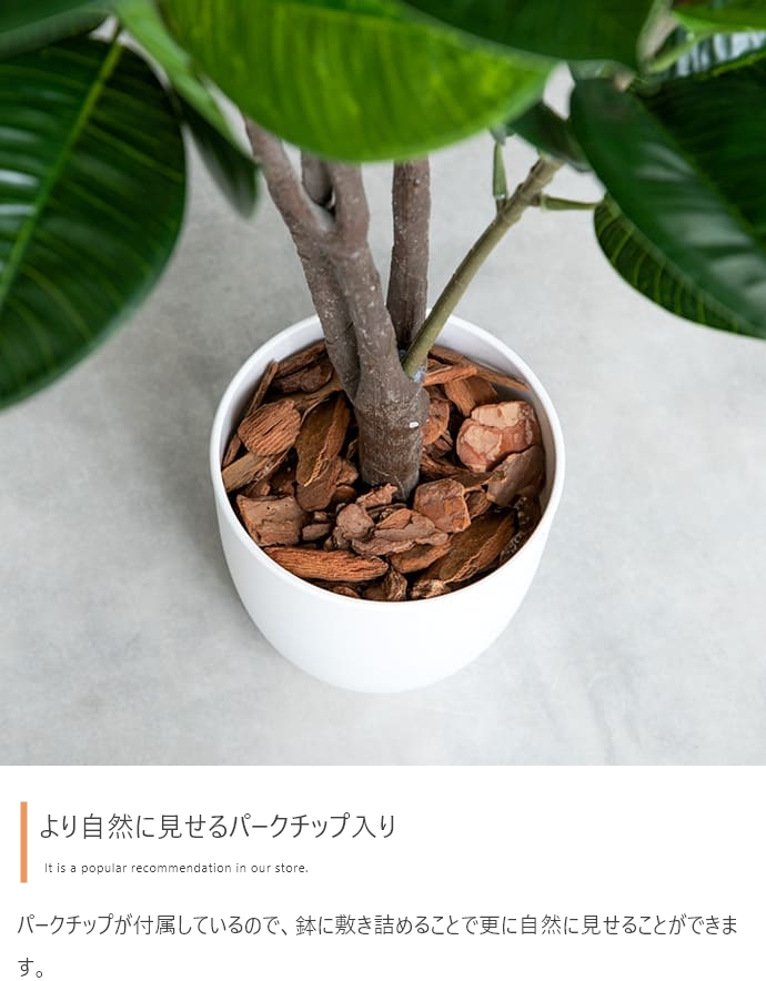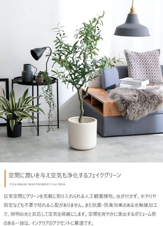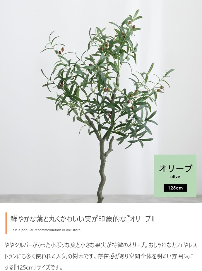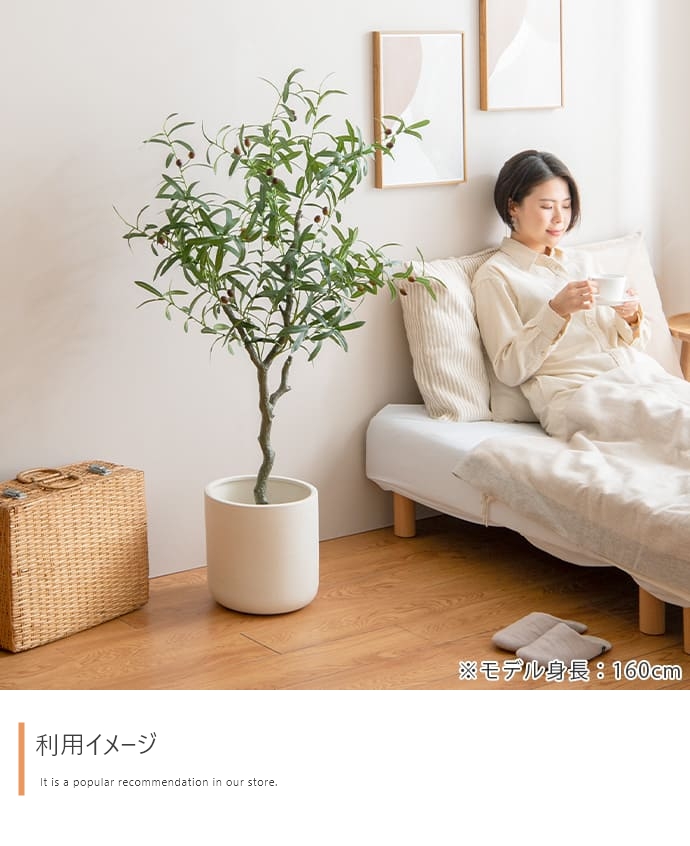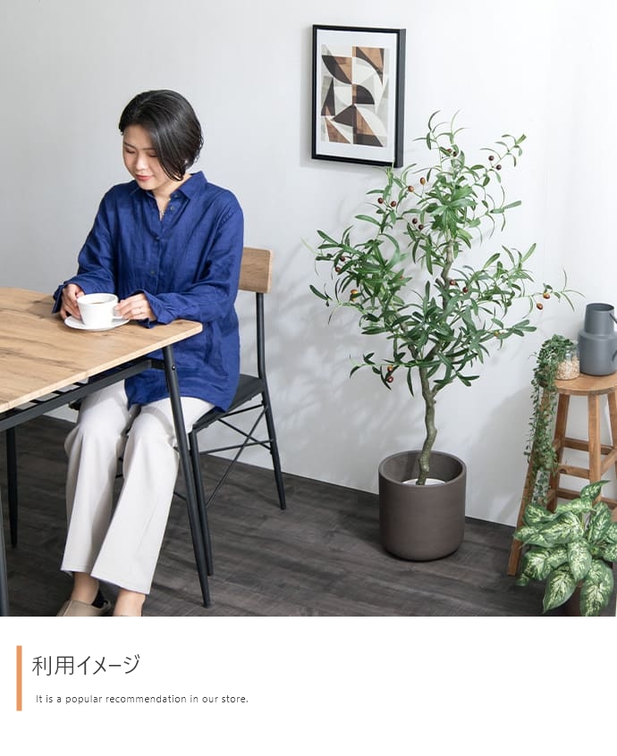 | 備考 | ※鉢カバーは付属しません。 ※個体差がある商品のため、実測サイズは葉や枝の広がり方により誤差が生じることがあります。 ※ワイヤーが内蔵された枝は若干の角度調節が可能ですが、無理な力を加えると破損する恐れがありますのでご注意ください。 ※屋内用のため、屋外や直射日光が当たる場所でのご使用は変色や劣化が早まる原因となるのでおやめください。 ※移動の際は樹木部分を持たずに鉢をもって移動させてください。 |