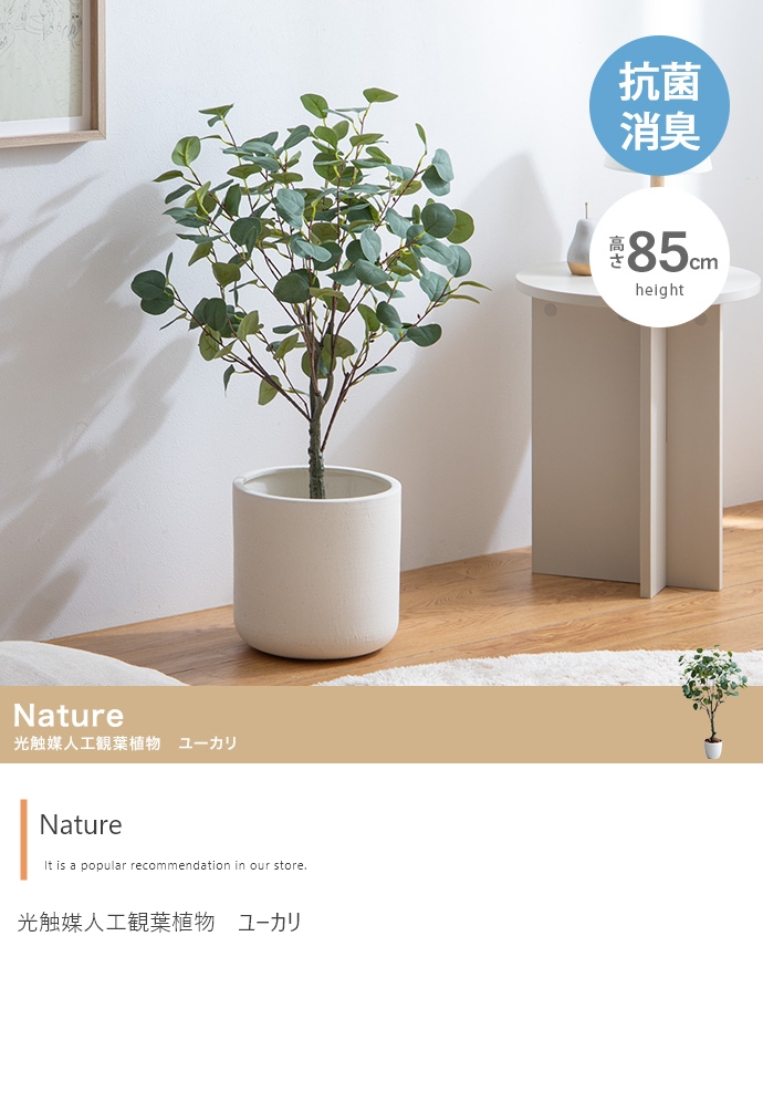 日常空間にグリーンを気軽に取り入れられる、光触媒人工観葉植物『Nature(ナチュレ)』シリーズのユーカリ。 照明光が当たることで消臭・抗菌・防汚・ホルムアルデヒド分解の効果を発揮します。面倒な水やりや剪定が不要なので、忙しくてなかなか植物のお世話ができない方にもおすすめです。