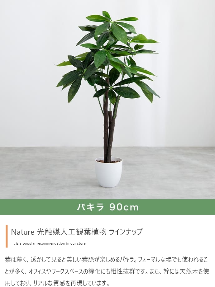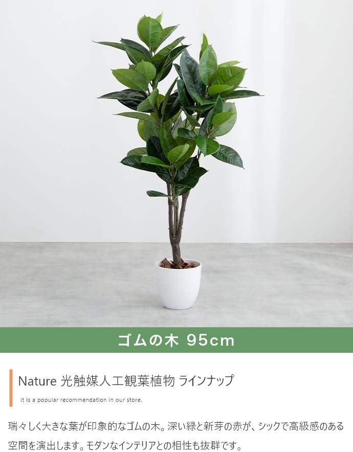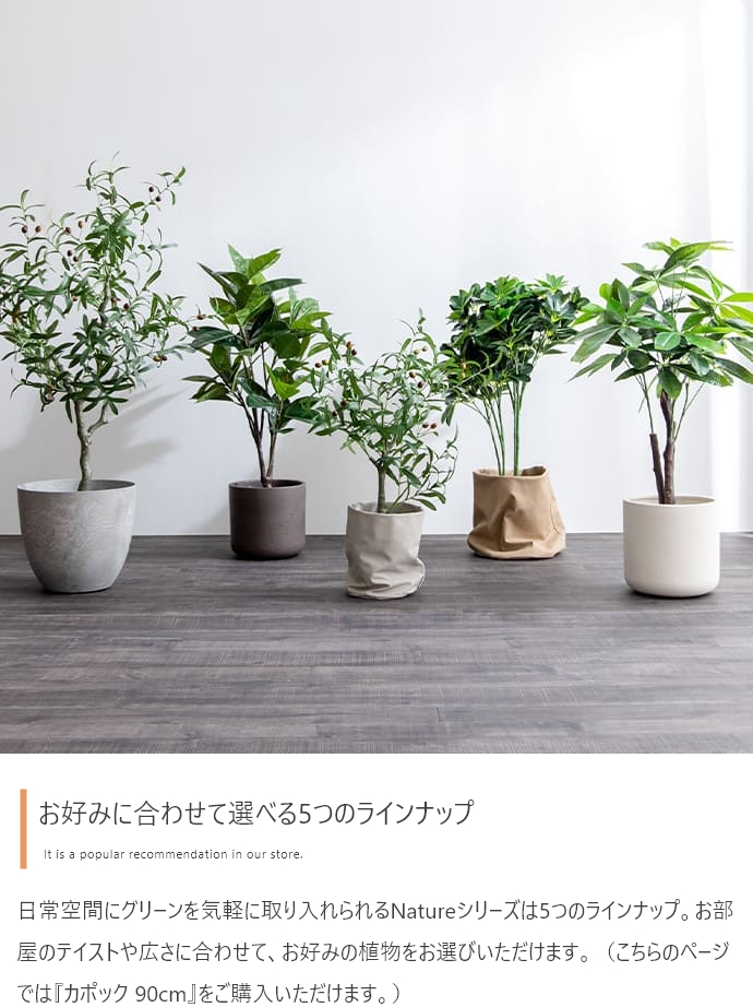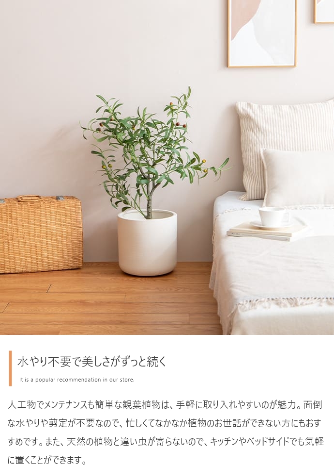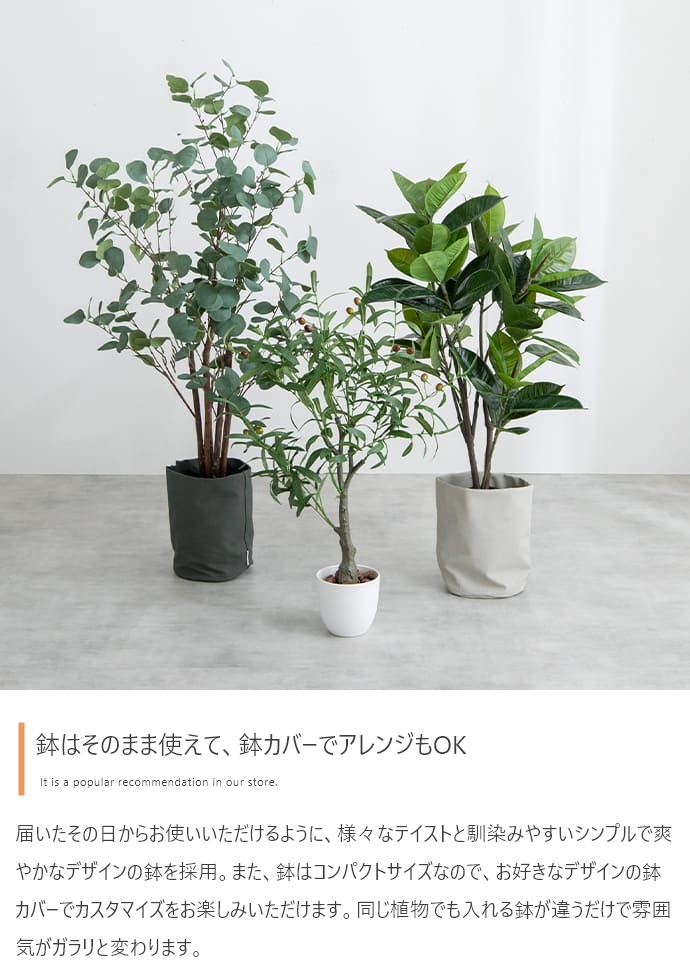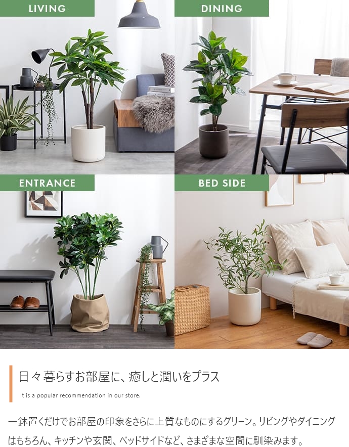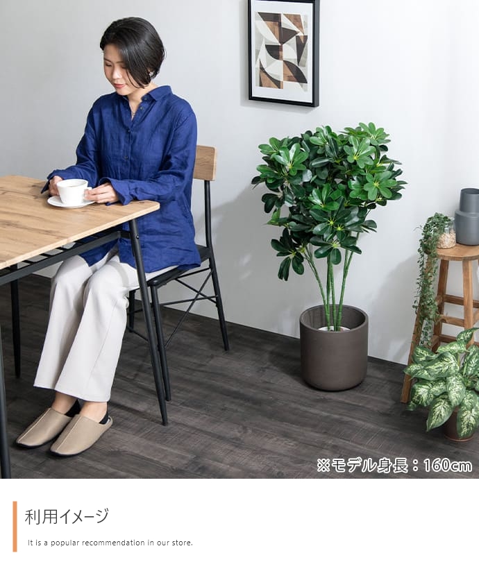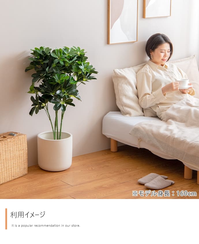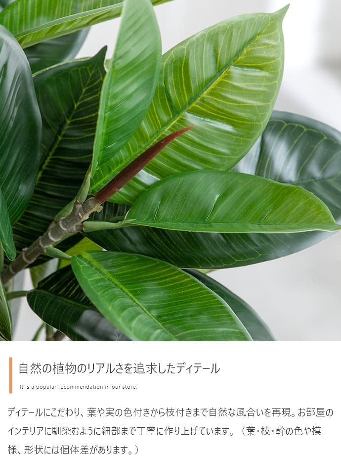 | 備考 | ※鉢カバーは付属しません。 ※個体差がある商品のため、実測サイズは葉や枝の広がり方により誤差が生じることがあります。 ※ワイヤーが内蔵された枝は若干の角度調節が可能ですが、無理な力を加えると破損する恐れがありますのでご注意ください。 ※屋内用のため、屋外や直射日光が当たる場所でのご使用は変色や劣化が早まる原因となるのでおやめください。 ※移動の際は樹木部分を持たずに鉢をもって移動させてください。 |