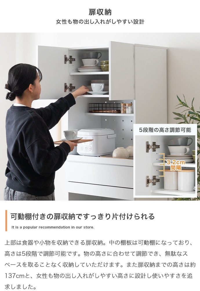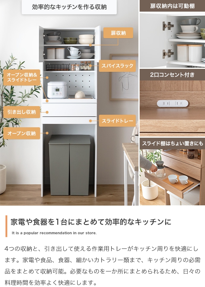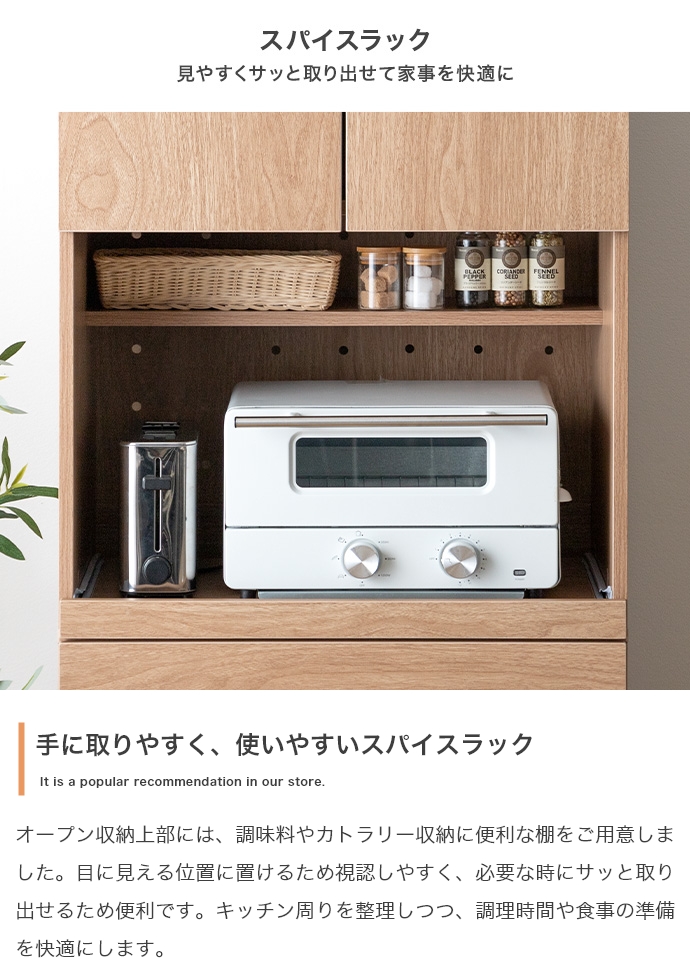 幅58cmのスリムサイズで、どんなキッチンにも圧迫感を与えず、限られたスペースにピッタリフィット。コンパクトなお部屋にも最適です。