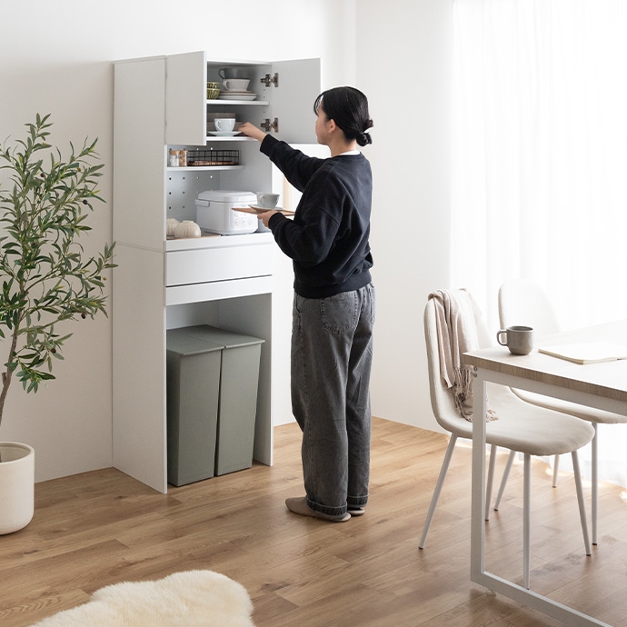 限られたスペースを最大限に活用する『Keuken(クークン)』のゴミ箱収納付きレンジ台。 ゴミ箱上のデッドスペースを有効活用し、スッキリとしたキッチンを作り出します。幅58cmのスリムサイズで、どんなキッチンにも圧迫感を与えず、機能性とデザイン性を兼ね備えたアイテムです。