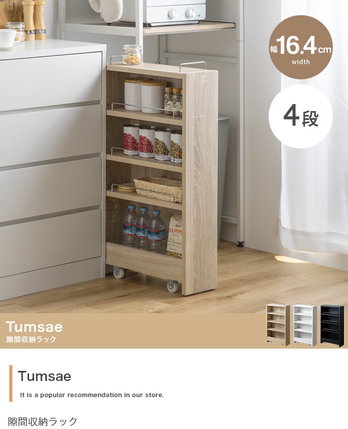 デッドスペースを有効活用できる『Tumsae(トゥムセ)』幅16.4cm隙間収納ラック。 ランドリーやキッチン周りでできる僅かな隙間にぴったりフィットし、見た目もすっきりと使いやすいスペースに変えます。隠しキャスター付きで、収納スペースは左右の向きを選べるので、どんな間取りでもお使いいただくことが可能です。