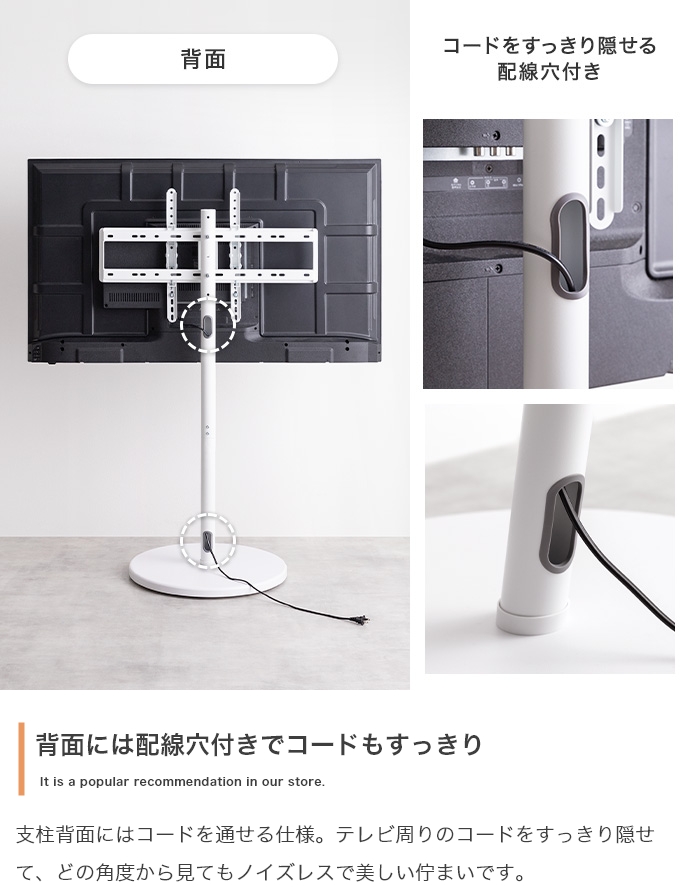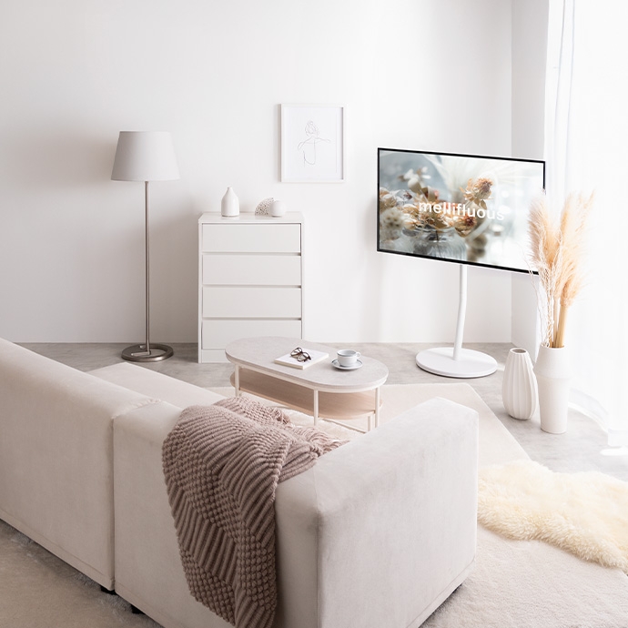 白いボディと丸い足元がかわいらしい『Lize(リゼ)』キャスター付きテレビスタンド。 角のない設計で、お部屋に柔らかな印象を与えてくれるデザインです。コンパクトサイズで、狭いスペースにもすっきりと置けるためワンルームにもぴったりです。