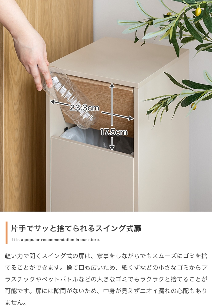 捨て口は蓋ではなく、スイング式の扉に。片手でサッとスムーズに捨てることができます。また捨て口の広さも、ペットボトルなどの大きいゴミが捨てられるようにサイズ感にこだわりました。