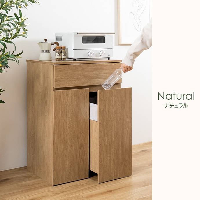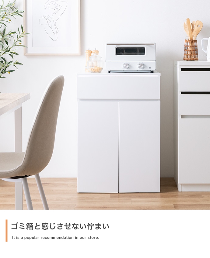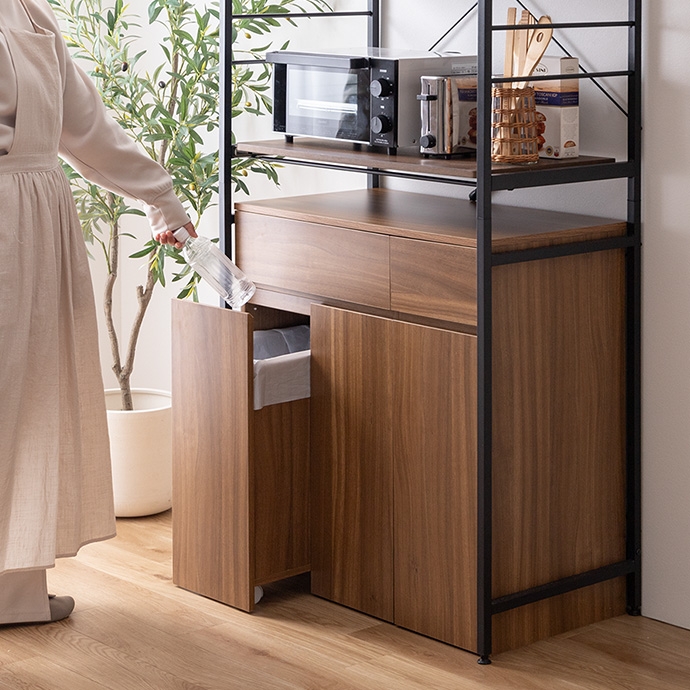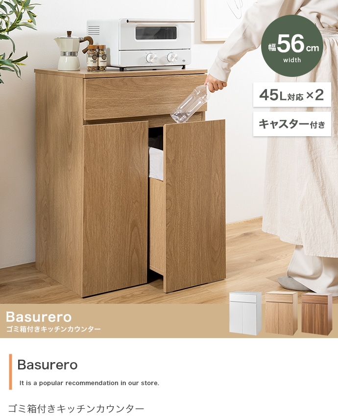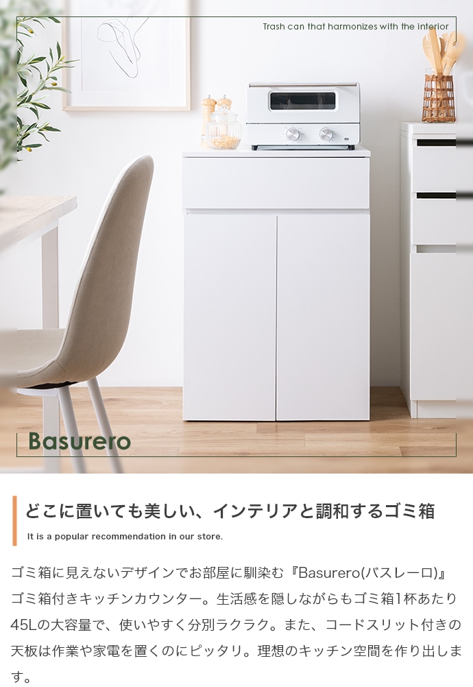 ゴミ箱に見えないデザインでお部屋に馴染む『Basurero(バスレーロ)』ゴミ箱付きキッチンカウンター。 生活感を隠しながらもゴミ箱1杯あたり45Lゴミ袋が入る大容量で、使いやすく分別もラクラク。コンパクトなこだわりのサイズ感はゴミ箱上ラックにも入り、理想のキッチン空間を作り出します。