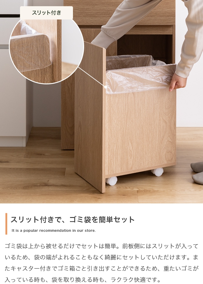 ゴミ箱に見えないデザインでお部屋に馴染みつつ、ゴミ箱1杯あたり45Lゴミ袋が入る大容量で、使いやすく分別もラクラクです。