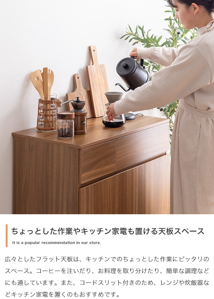 コードスリット付きの天板は、ちょっとした作業をしたりキッチン家電を置くのにもピッタリです。