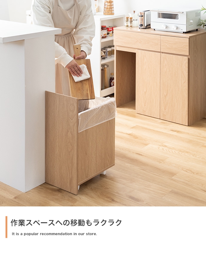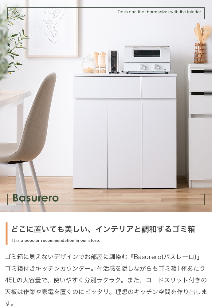 ゴミ箱に見えないデザインでお部屋に馴染む『Basurero(バスレーロ)』ゴミ箱付きキッチンカウンター。 生活感を隠しながらもゴミ箱1杯あたり45Lゴミ袋が入る大容量で、使いやすく分別ラクラク。コンパクトなこだわりのサイズ感はゴミ箱上ラックにも入り、理想のキッチン空間を作り出します。