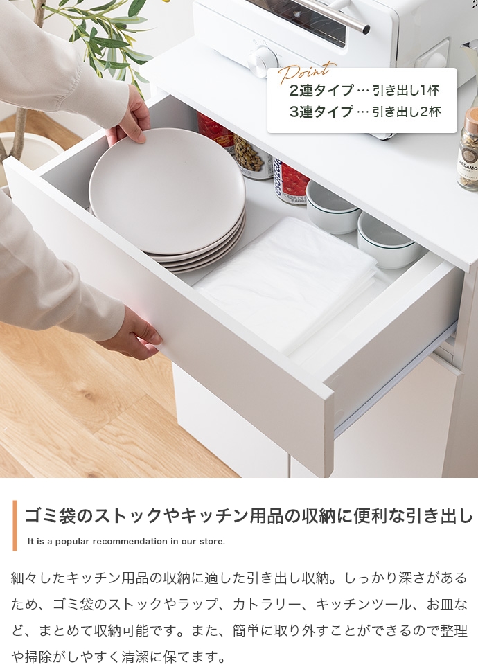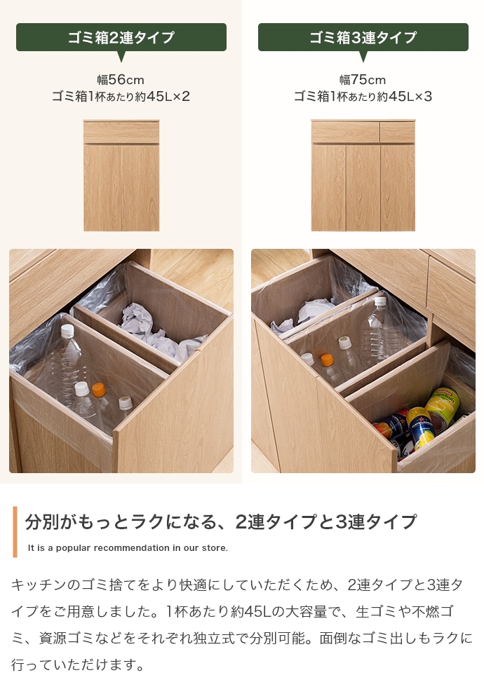 キッチンカウンター ゴミ箱付き 45L×3 幅75cm