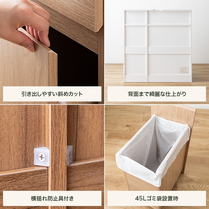 ゴミ箱に見えないデザインでお部屋に馴染みつつ、ゴミ箱1杯あたり45Lゴミ袋が入る大容量で、使いやすく分別もラクラクです。