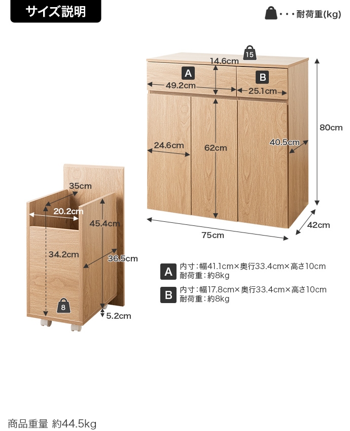 天板:約15kg 、引き出し(各):約8kg、ゴミ箱底板(各):約8kg |