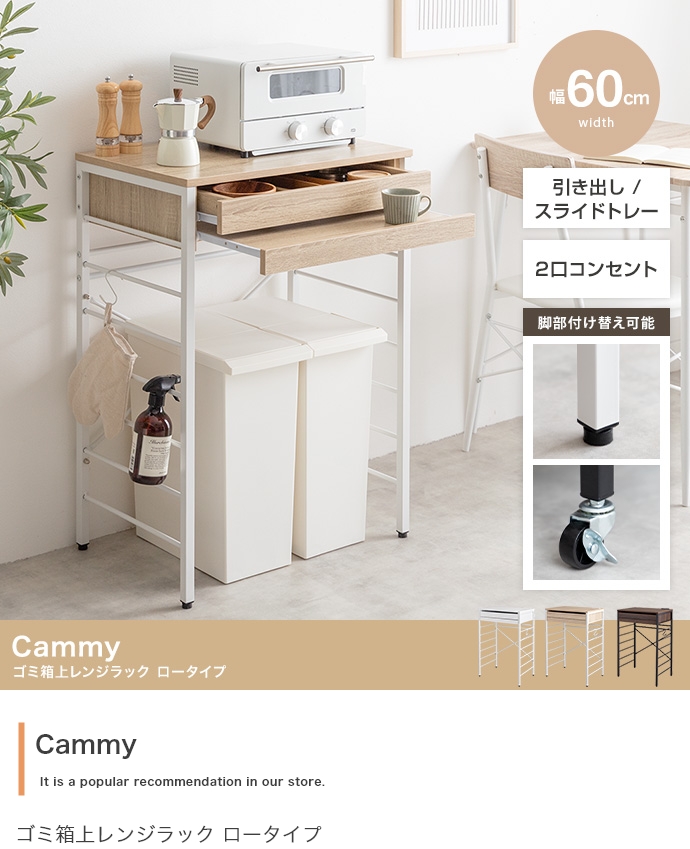 ゴミ箱上のデッドスペースを収納・作業スペースとして有効的に活用する『Cammy(キャミー)』ゴミ箱上レンジラック。 ワイドな引き出しとちょい置きできるスライドトレーは、手狭なキッチンをすっきり整理し快適にします。アジャスターとキャスターの部品がどちらも付属しており、用途に合わせてお好きなスタイルでお使いいただけます。