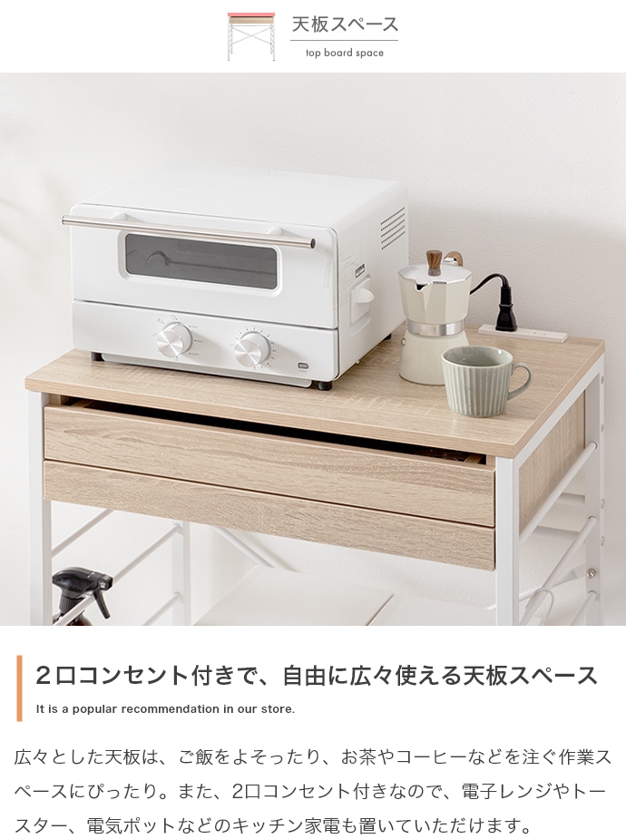 天板には2口コンセントが付いており、キッチン家電を置くことも可能です。
