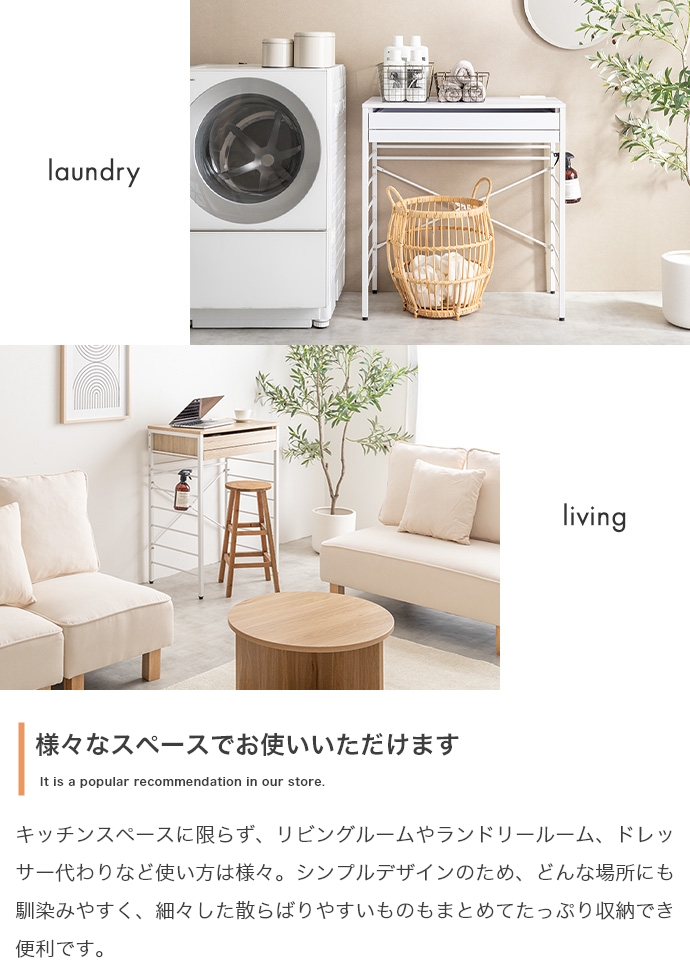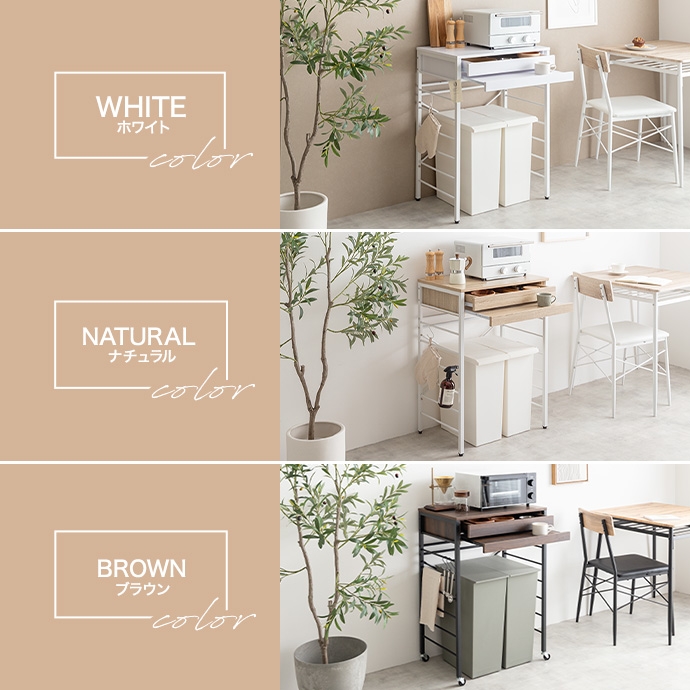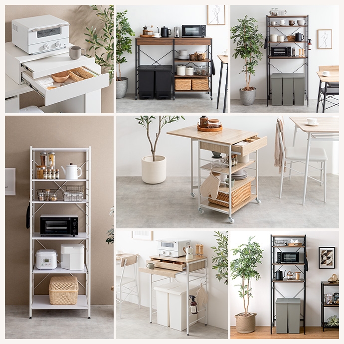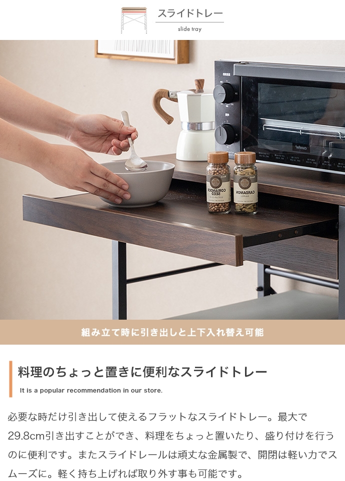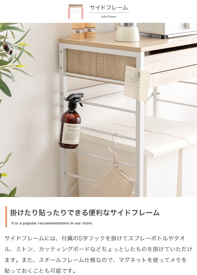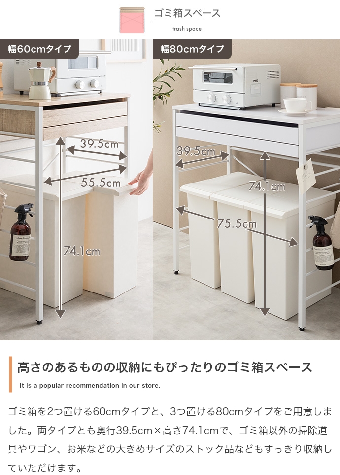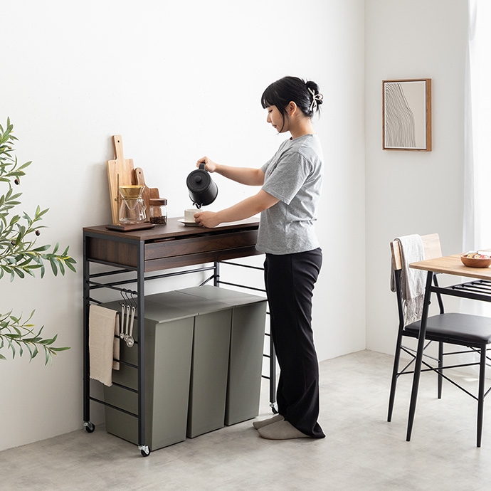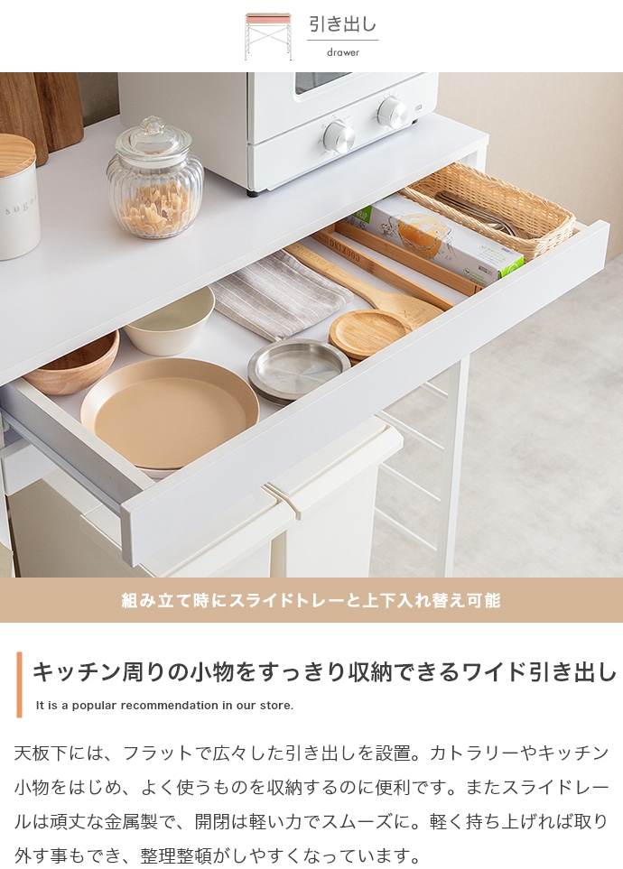 ゴミ箱上のデッドスペースを収納・作業スペースとして活用。ワイドな引き出しとちょい置きできるスライドトレーは、手狭なキッチンをすっきり整理し快適にします。