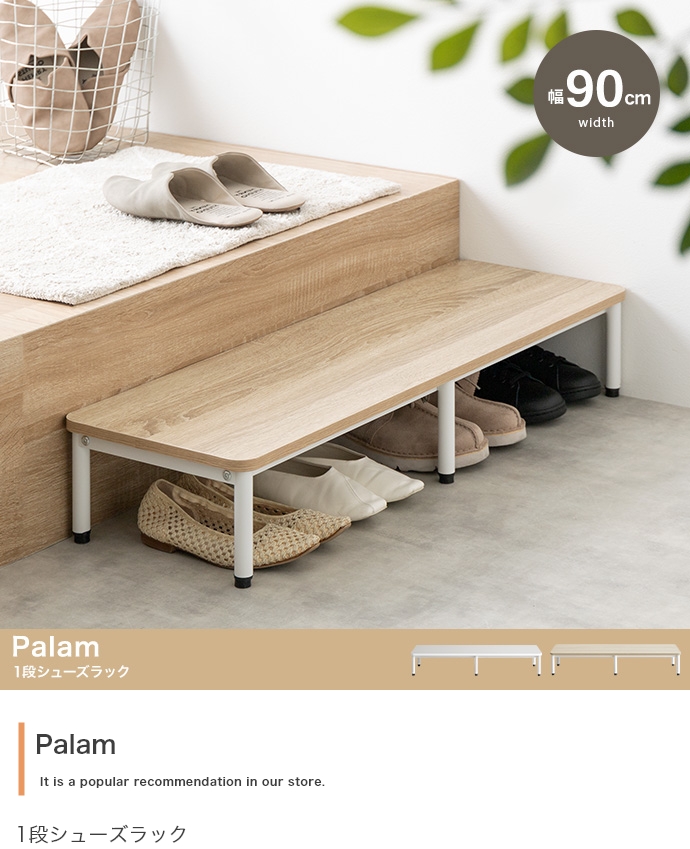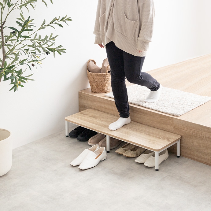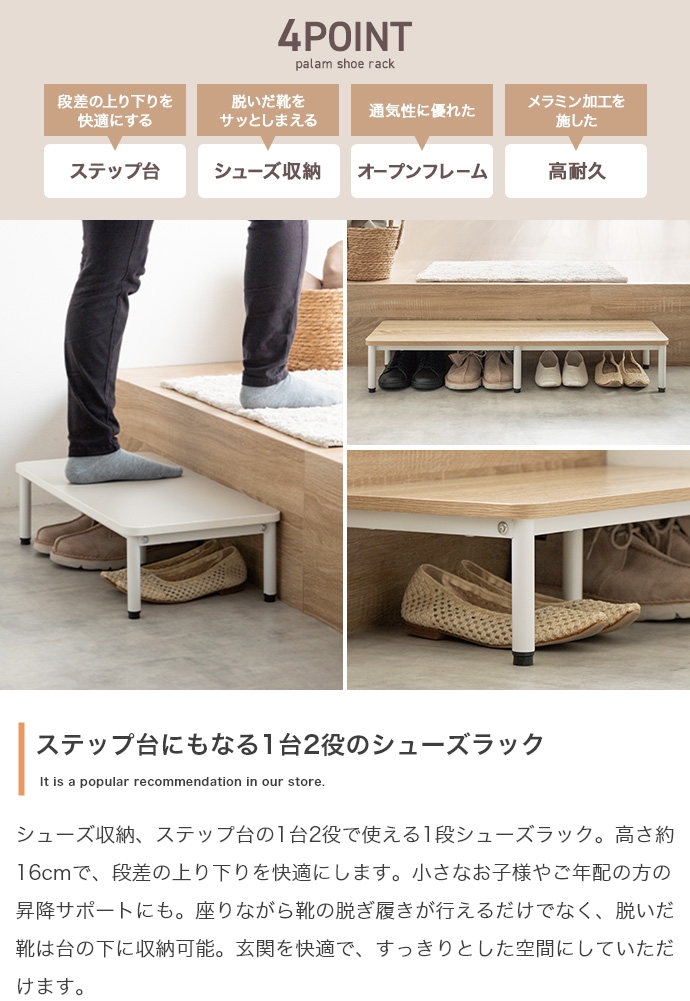 シューズ収納、ステップ台の1台2役で使える『Palam(パラム)』1段シューズラック。 高さ約16cmで玄関の段差を緩和し、足腰への負担を軽減します。家族みんなが快適に使える玄関を実現します。