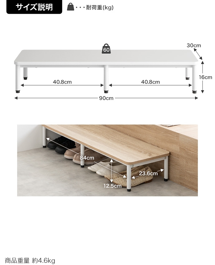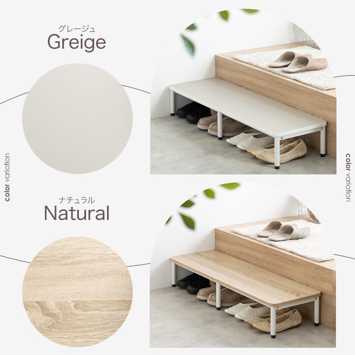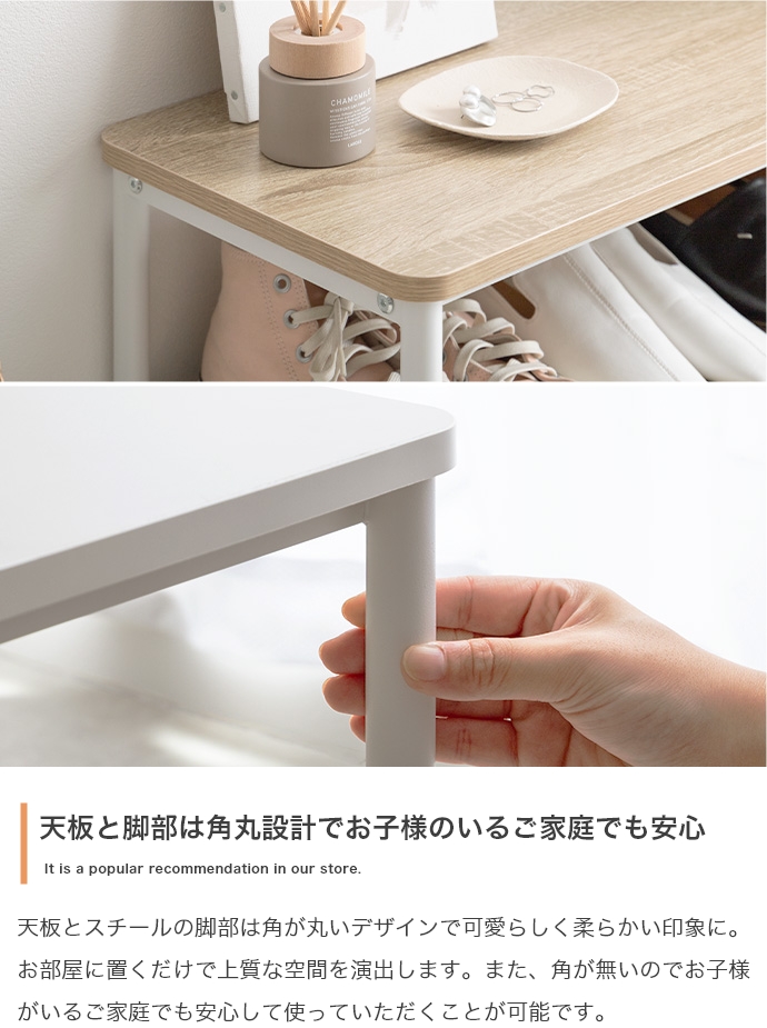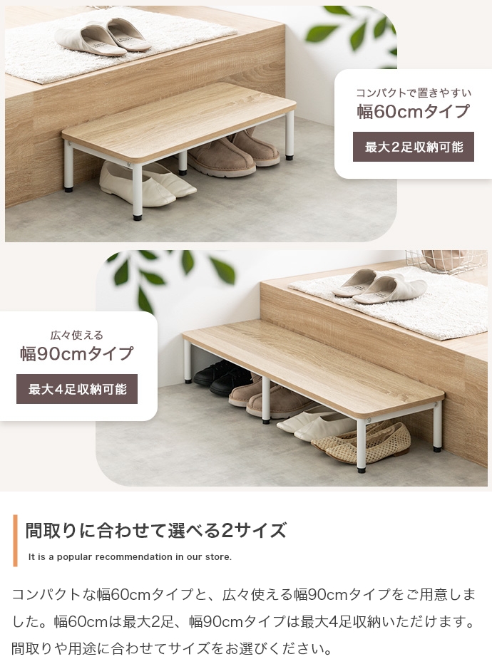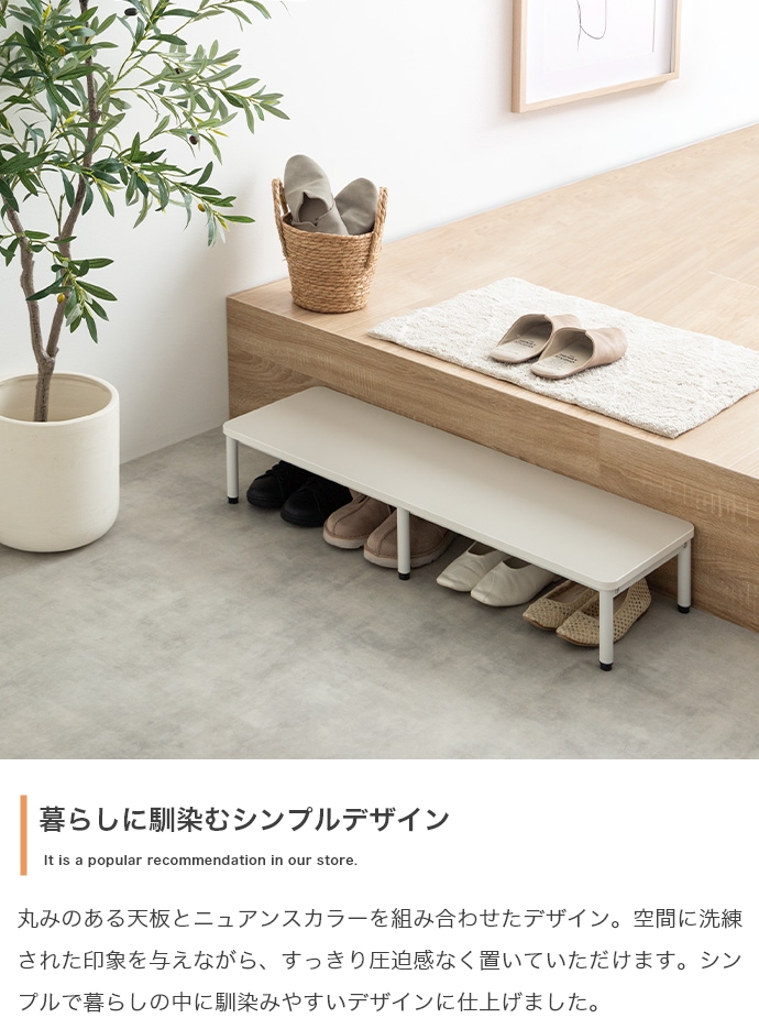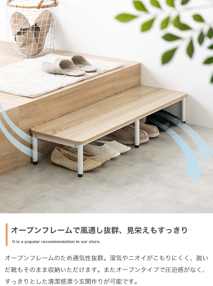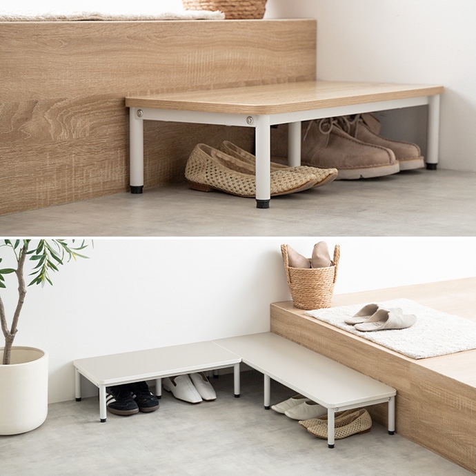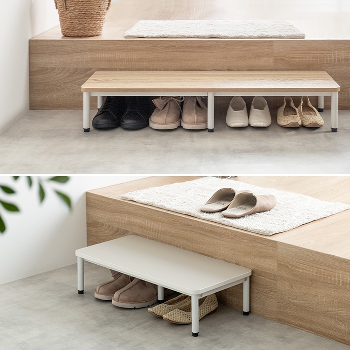 脱いだ靴はそのまま台の下に収納可能。散らかりがちな玄関をすっきりと整頓できます。