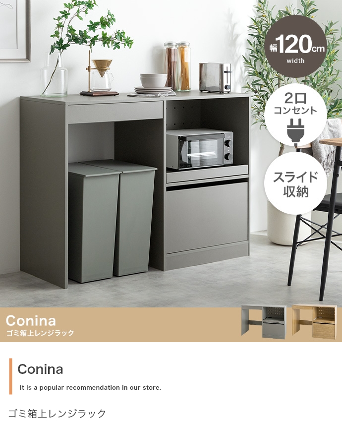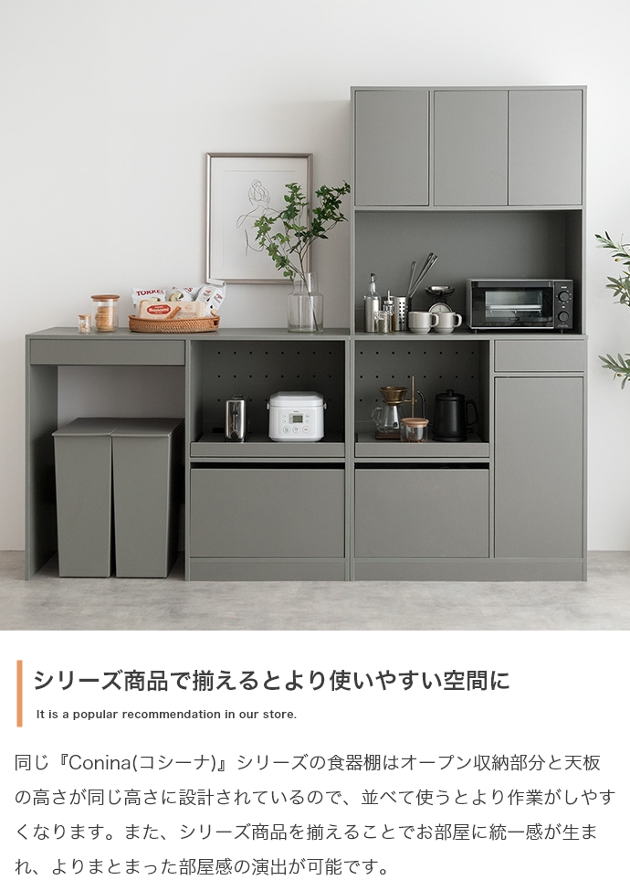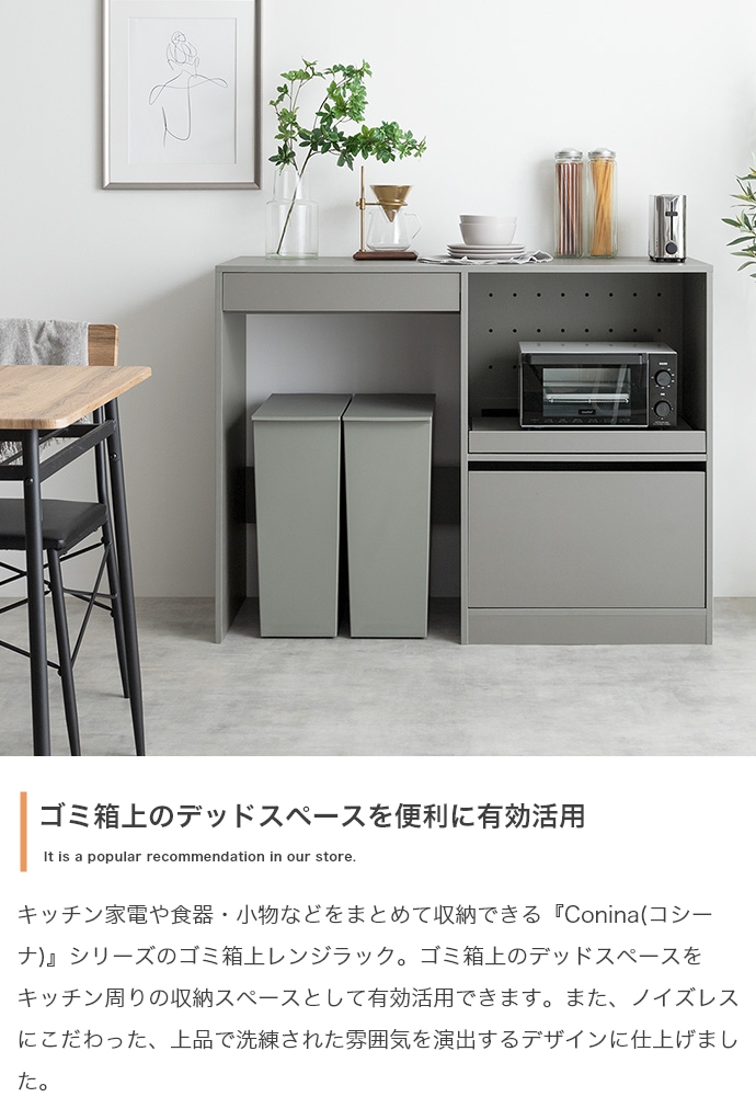 キッチン家電や食器・小物などをまとめて収納できる『Conina(コシーナ)』シリーズのゴミ箱上レンジラック。 ゴミ箱上のデッドスペースをキッチン周りの収納スペースとして有効活用でき、キッチンに適しながらも上品で洗練された雰囲気を演出します。