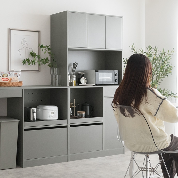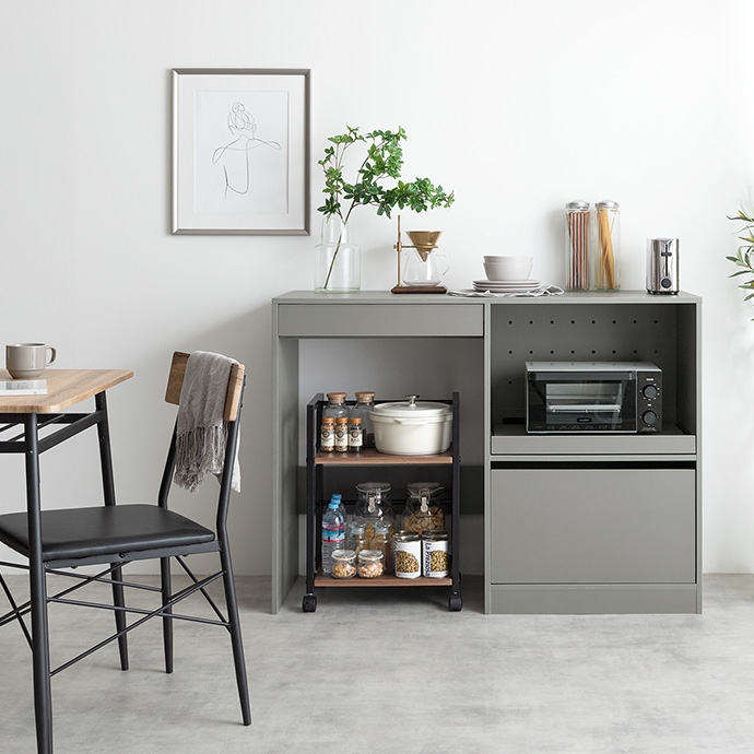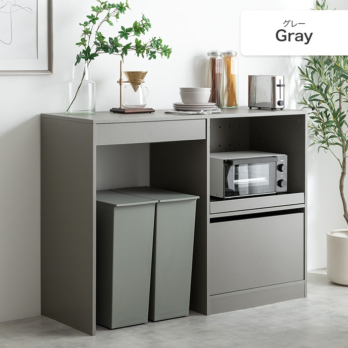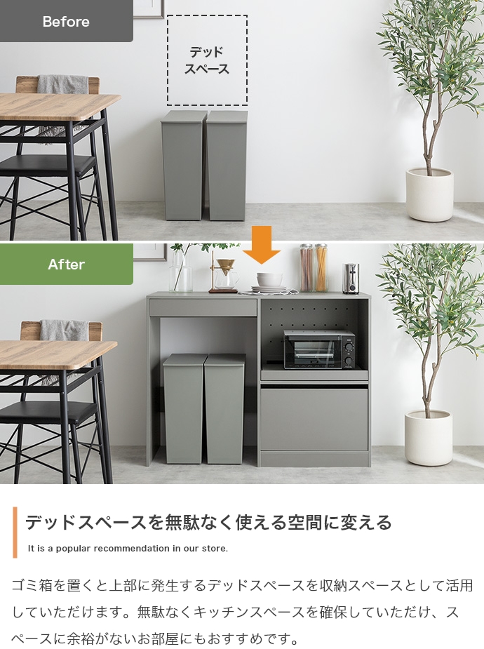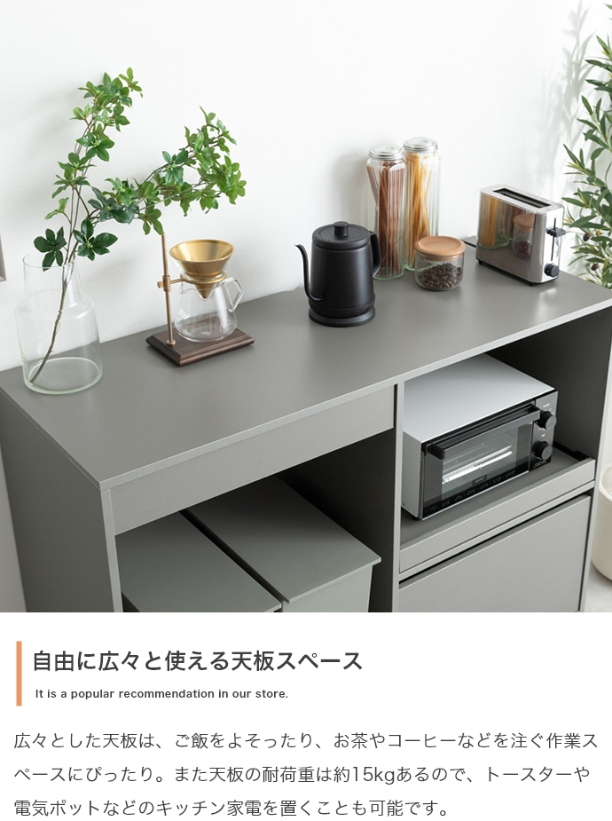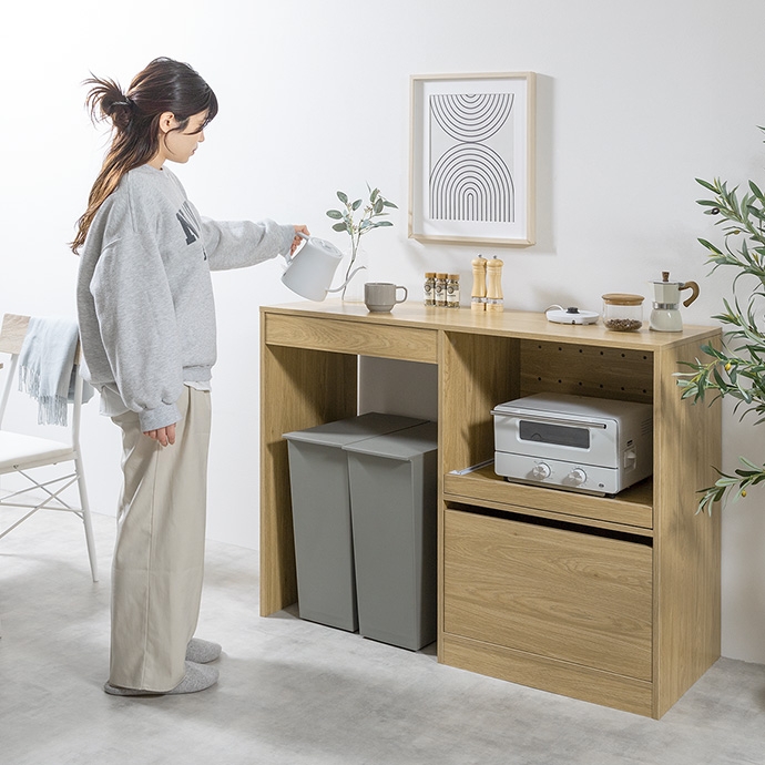 キッチン家電や食器・小物などをまとめて収納可能。ゴミ箱上のデッドスペースをキッチン周りの収納スペースとして有効活用できます。