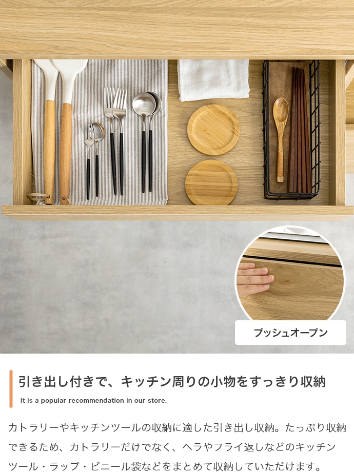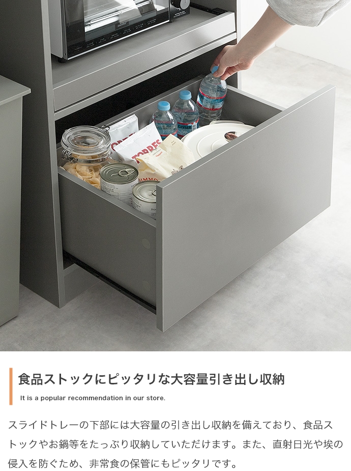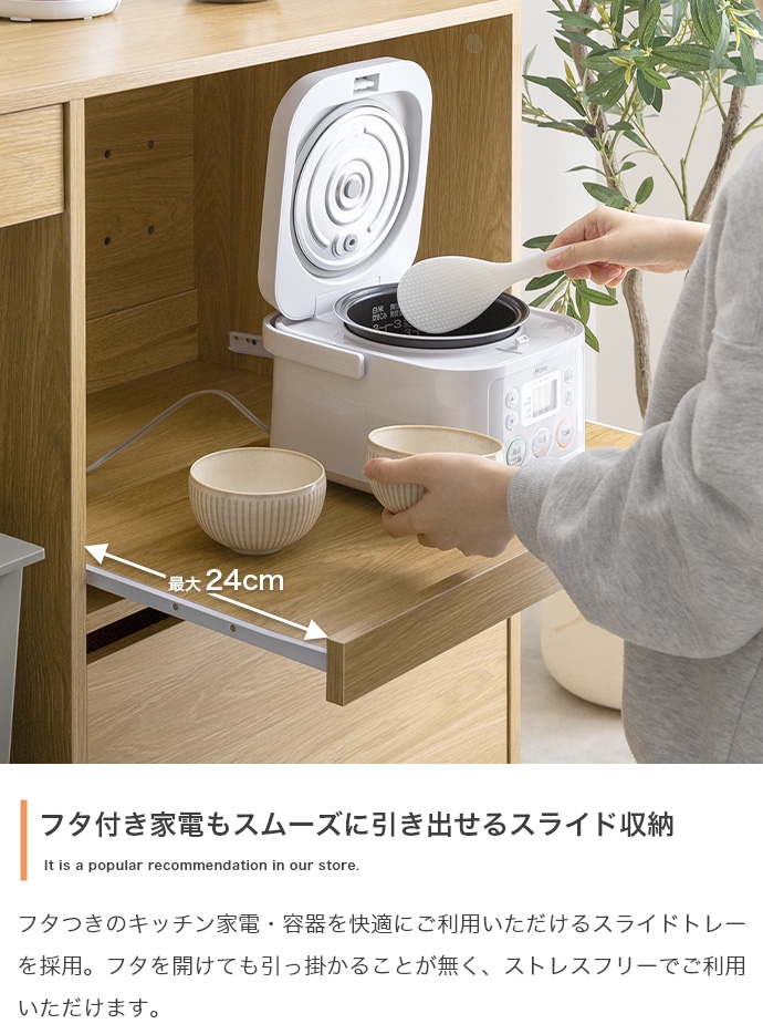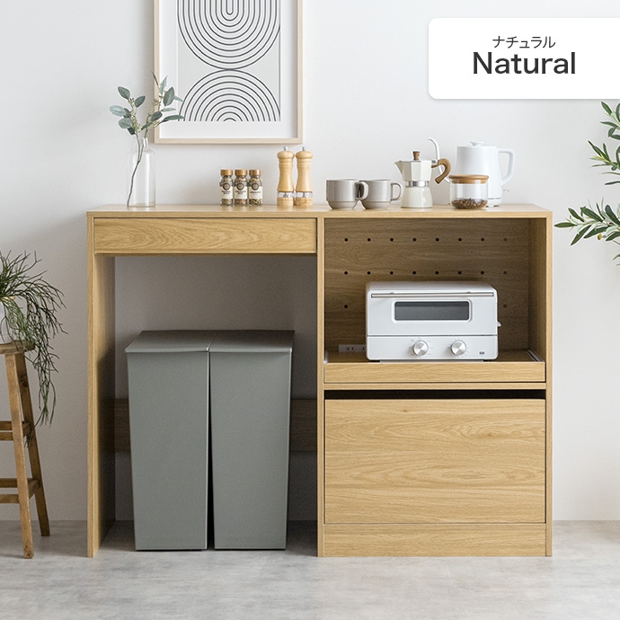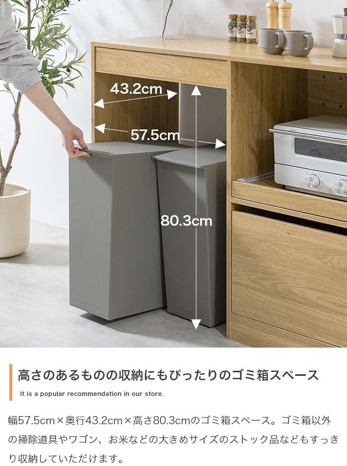 キッチン家電や食器・小物などをまとめて収納可能。ゴミ箱上のデッドスペースをキッチン周りの収納スペースとして有効活用できます。