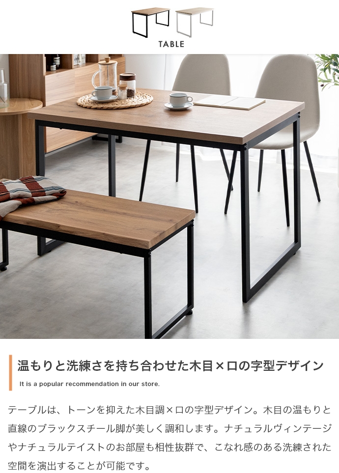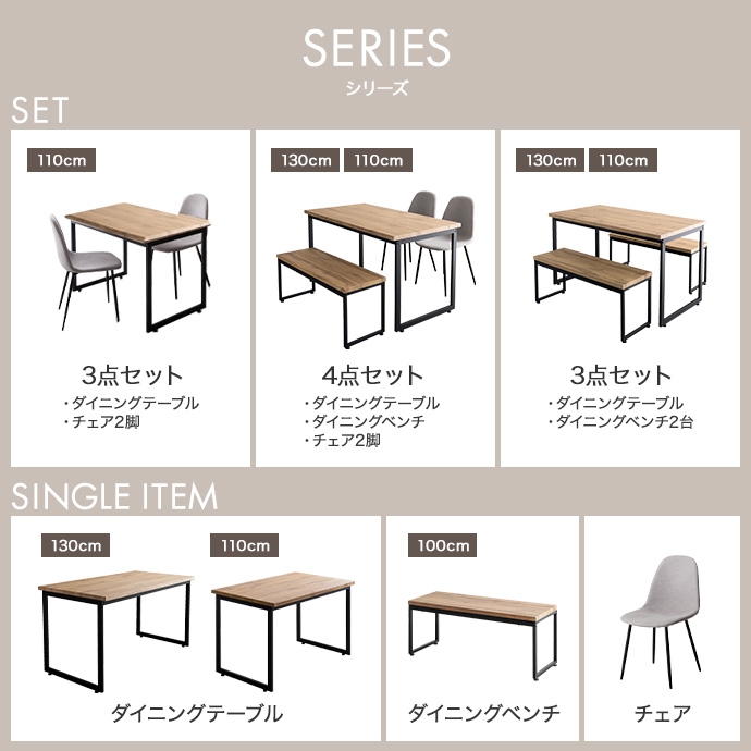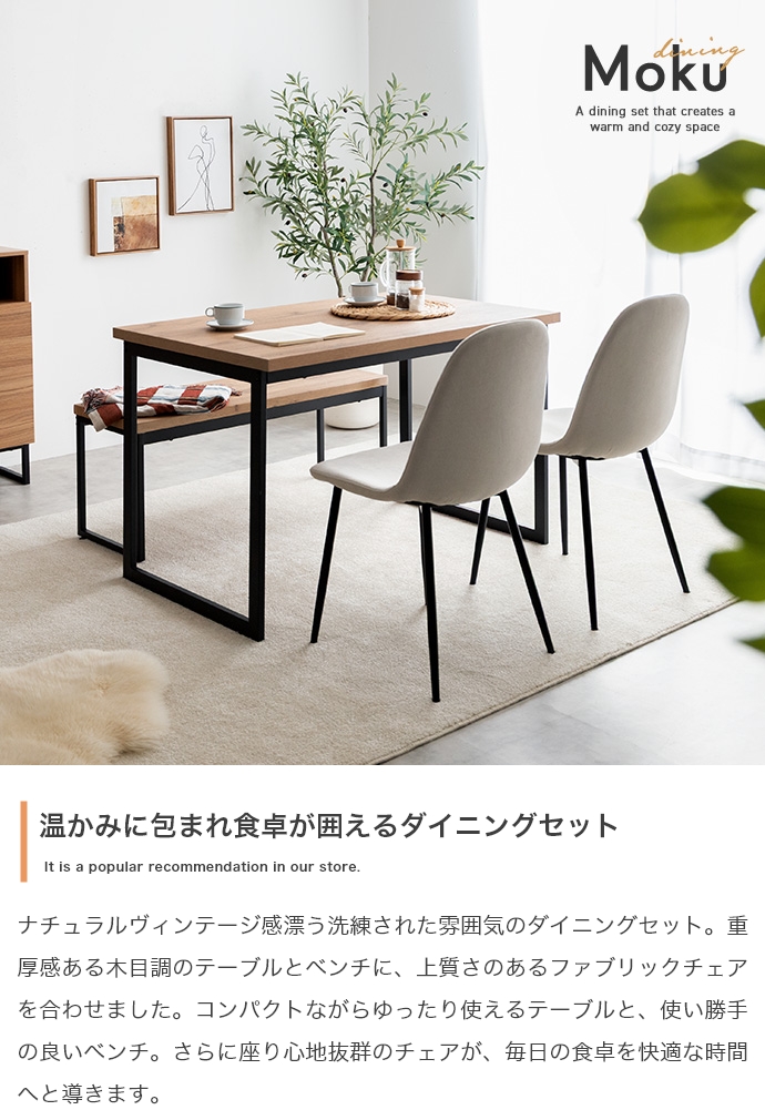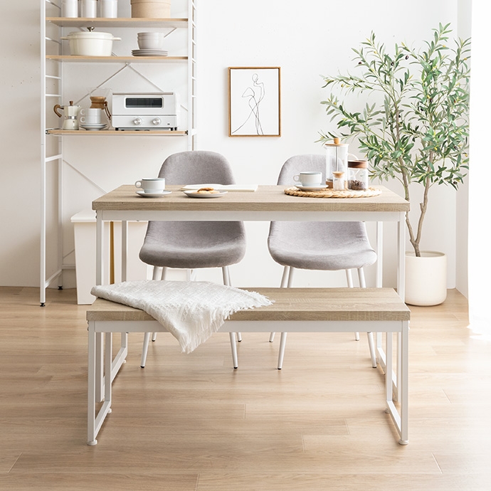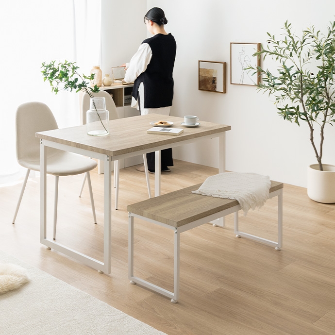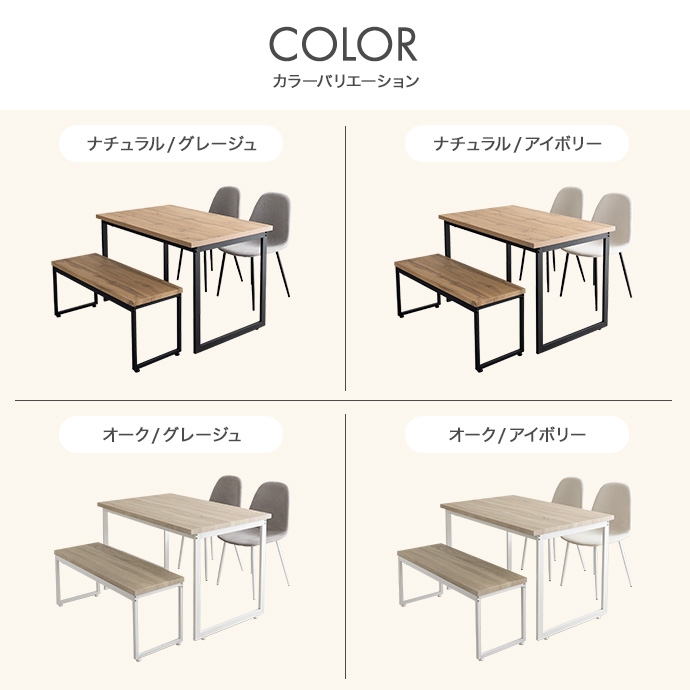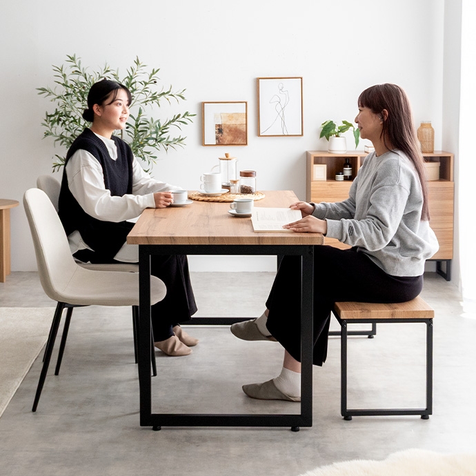 | 素材 | 【テーブル・ベンチ】MDF(PVC貼り) 【チェア】布材:ファブリック、中材:ウレタンフォーム 【テーブル・ベンチ】スチール(粉体塗装) 【チェア】アイアン(粉体塗装) |