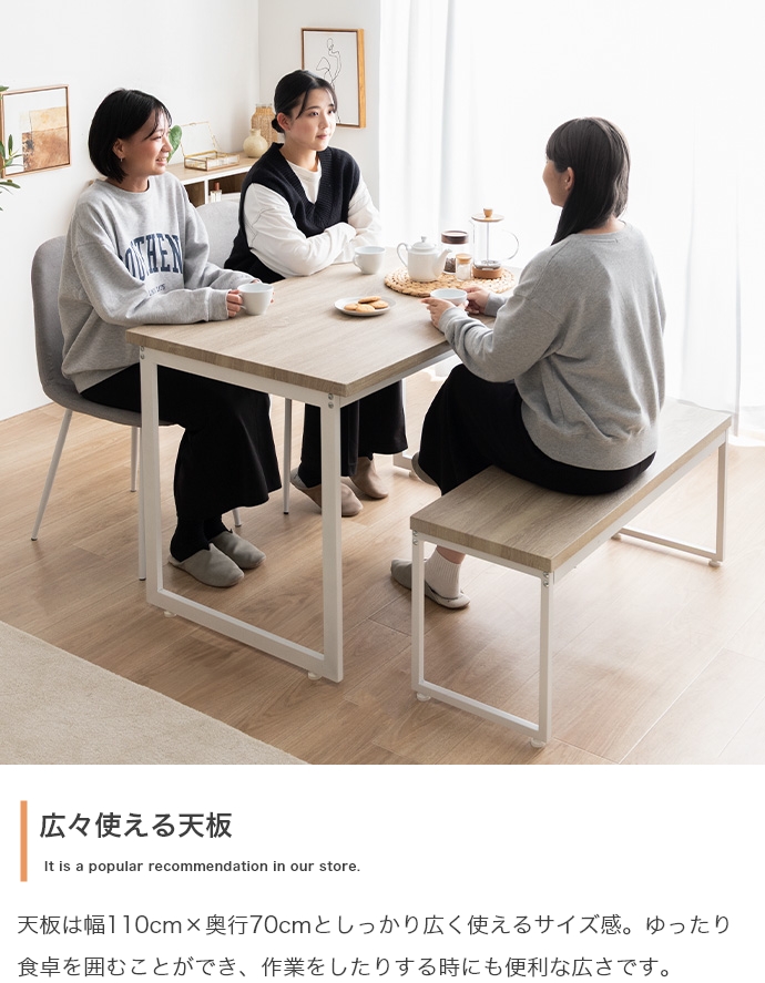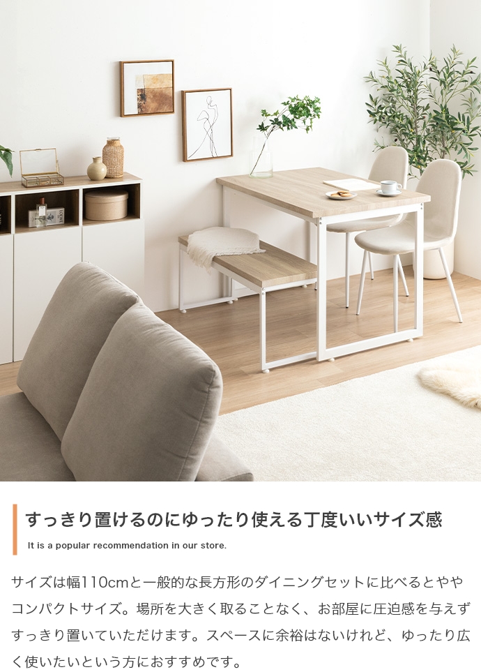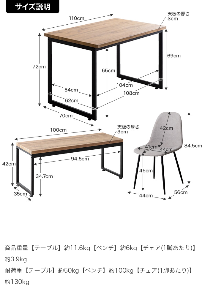 | サイズ | 【テーブル】幅110 × 奥行70 × 高さ72cm 【ベンチ】幅100 × 奥行35 × 高さ42cm 【チェア】幅44 × 奥行56 × 高さ84.5 × 座面高:45cm |