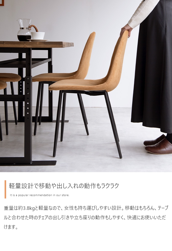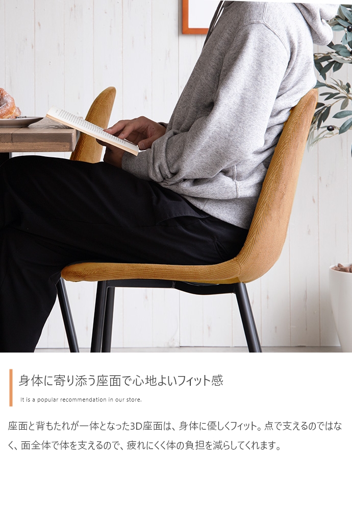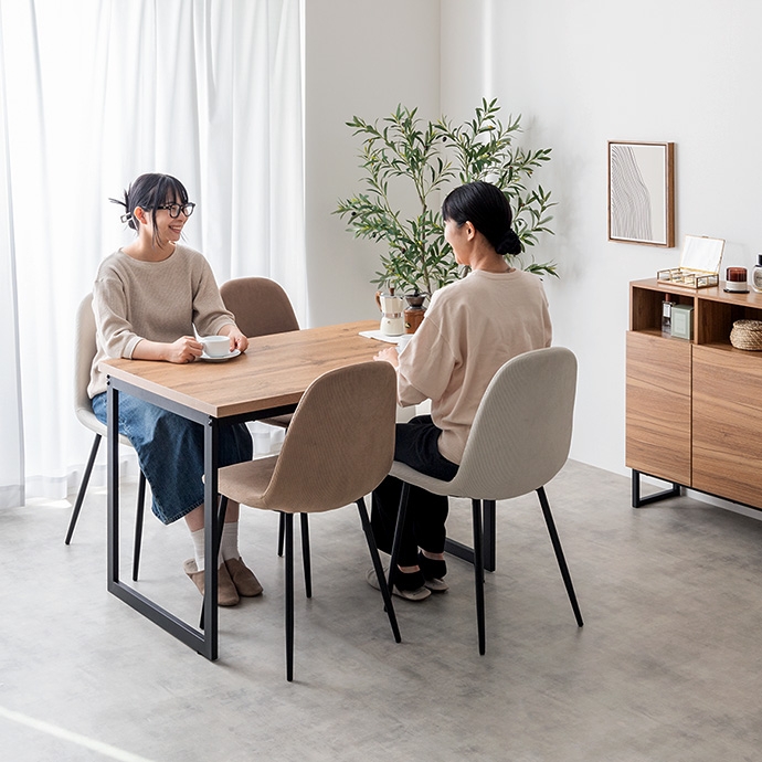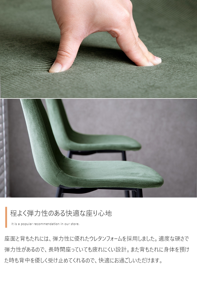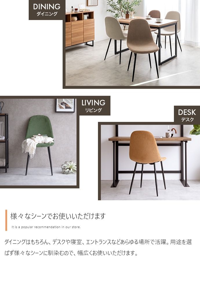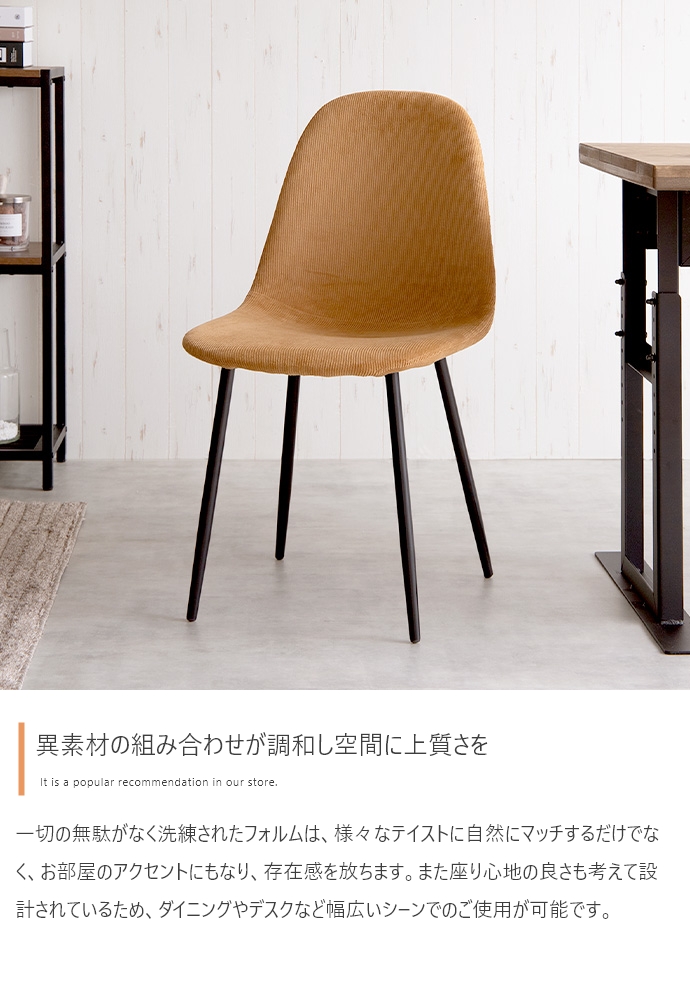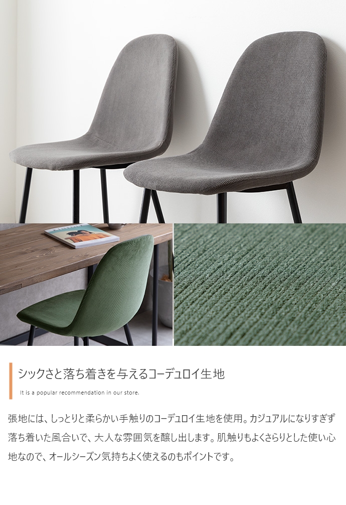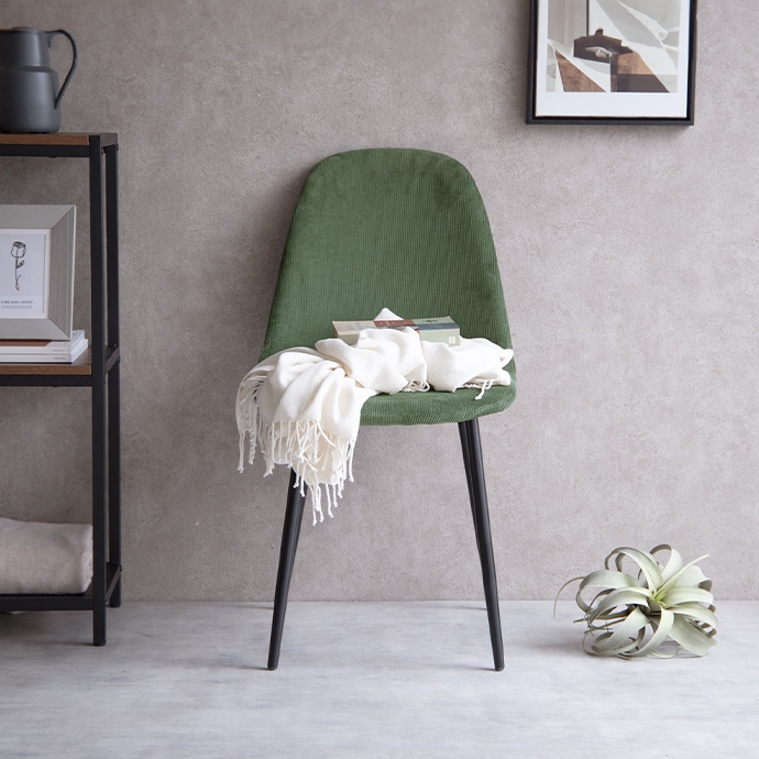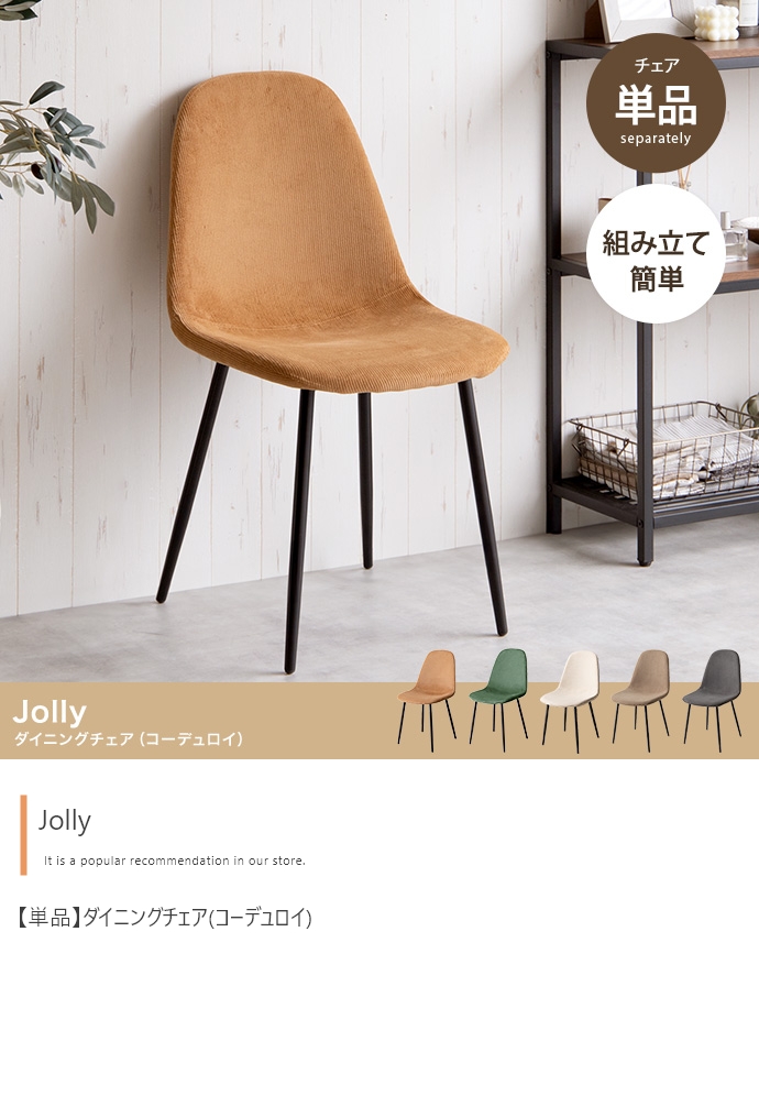 洗練されたデザインと機能性を兼ね備えたダイニングチェア『Jolly(ジョリー)』。 温かみのあるコーデュロイ生地を使用した一人掛けダイニングチェアです。