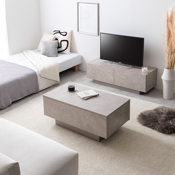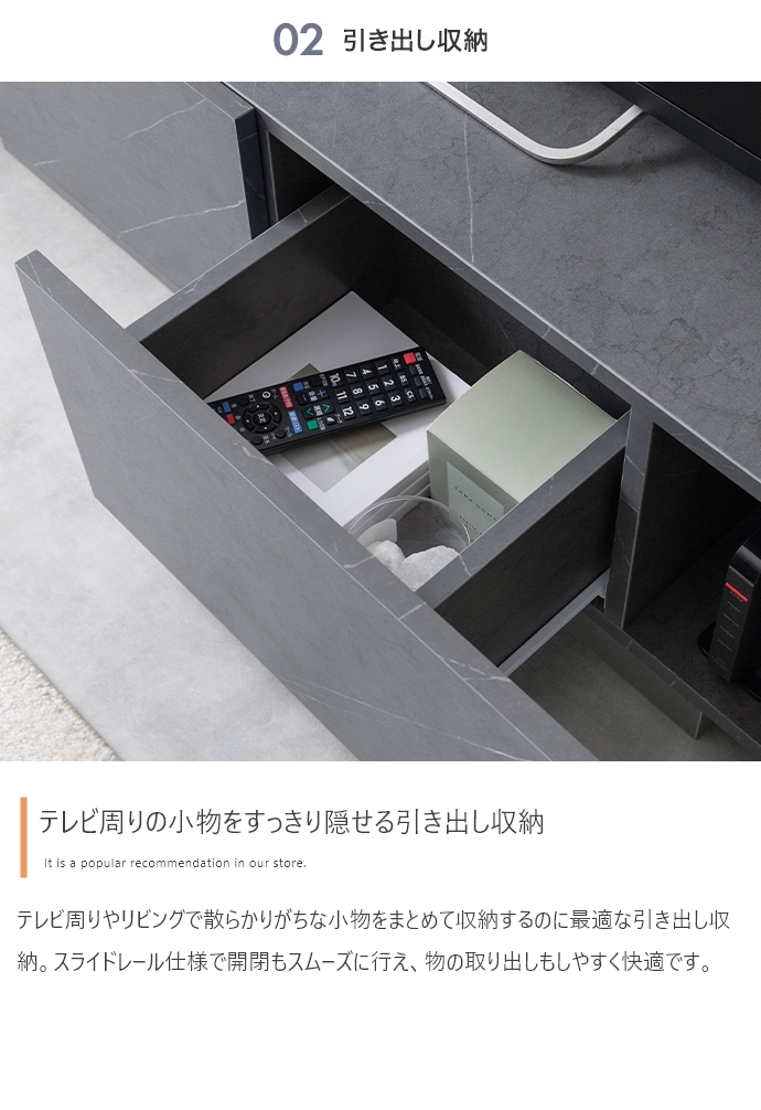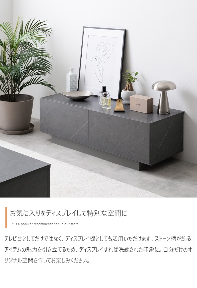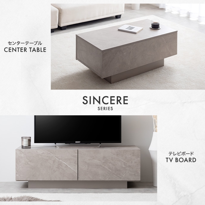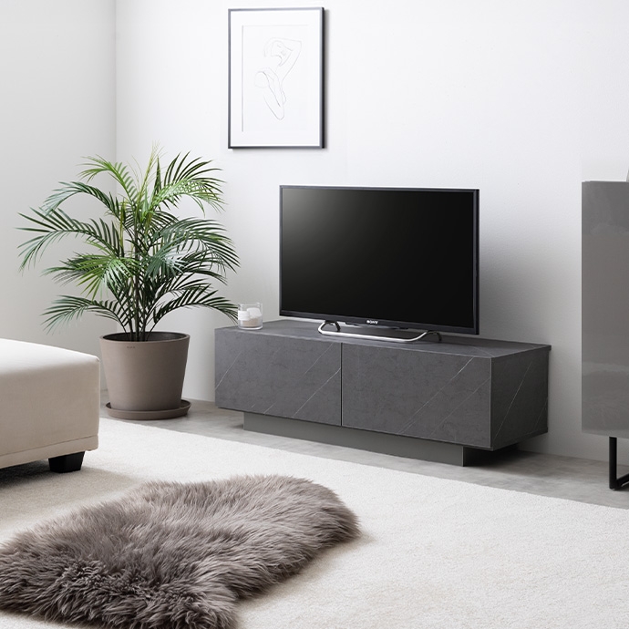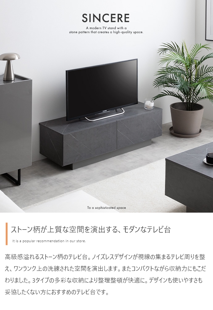 ストーン柄のニュアンスが上質な空間を作る『Sincere(シンシア)』引き出し付きテレビ台。 無駄を省いたノイズレスなフォルムと、ストーン柄の組み合わせが美しいデザイン。視線の集まるテレビ周りをすっきり整えられるテレビ台です。