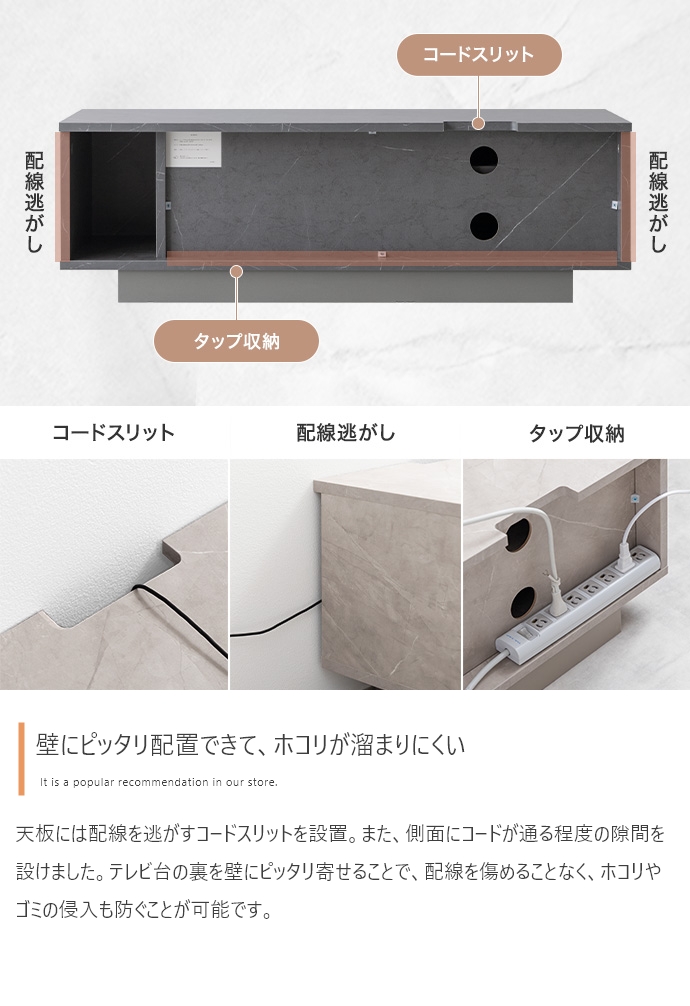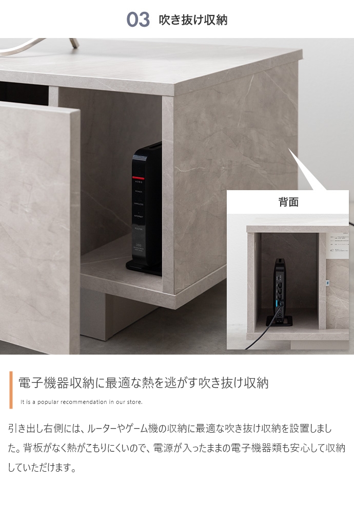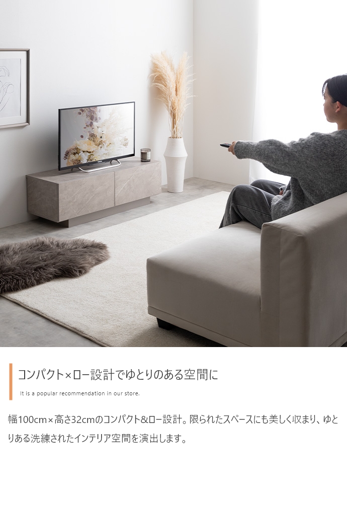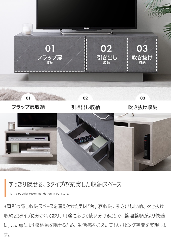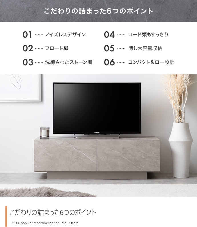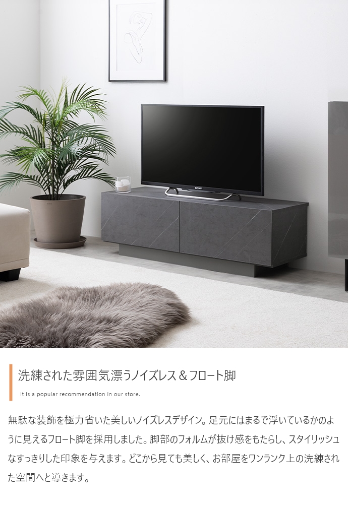 ストーン柄のニュアンスが上質な空間を作る『Sincere(シンシア)』引き出し付きテレビ台。 無駄を省いたノイズレスなフォルムと、ストーン柄の組み合わせが美しいデザイン。視線の集まるテレビ周りをすっきり整えられるテレビ台です。