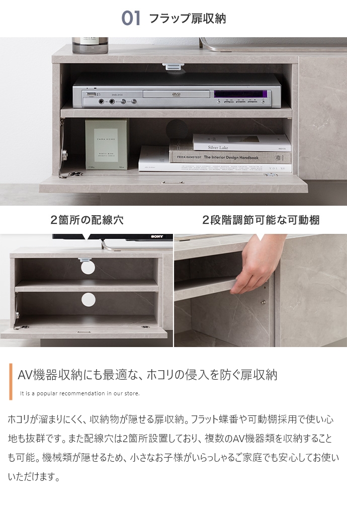 3種類の収納スペースにより、デジタル機器や小物を収納可能。視線の集まるテレビ周りをすっきり整えられます。