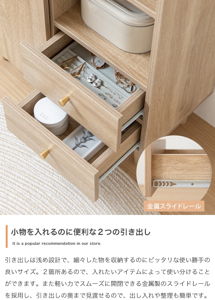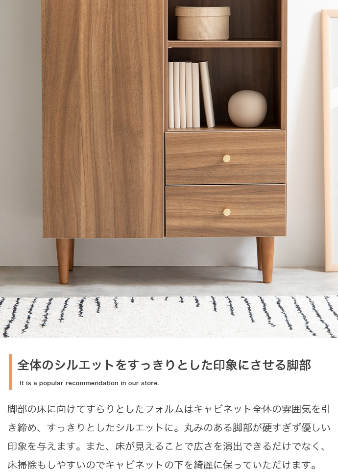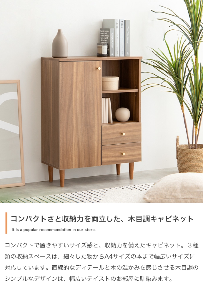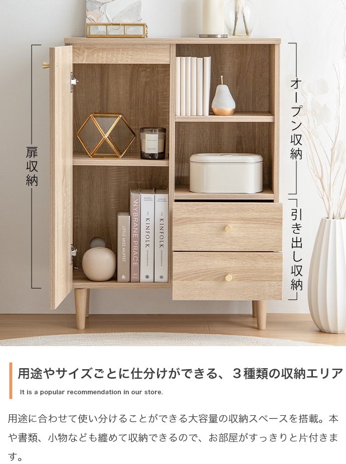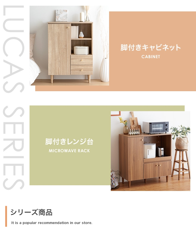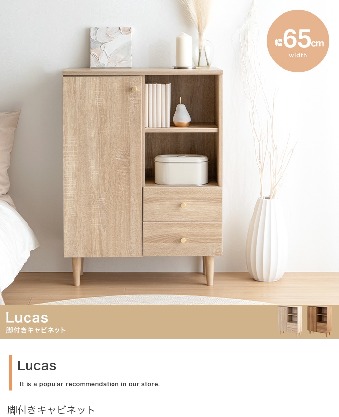 コンパクトさと収納力を両立した『Lucas(リュカ)』シリーズの脚付きキャビネット。 用途やサイズごとに仕分けができる3種類の収納エリアを設け、本や書類、小物なども纏めて収納できます。一人暮らしにお勧めのコンパクトサイズで、置き場所を取りません。